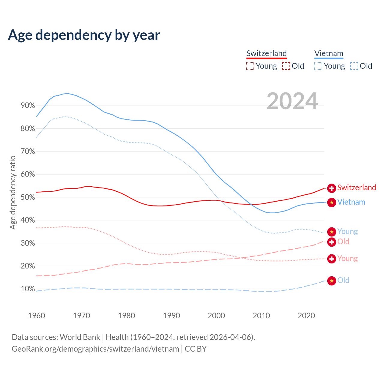 Data sources: World Bank | Health (1960–2024, retrieved 2026-04-06); U.S. Census Bureau (1960–2024, retrieved 2026-02-08).