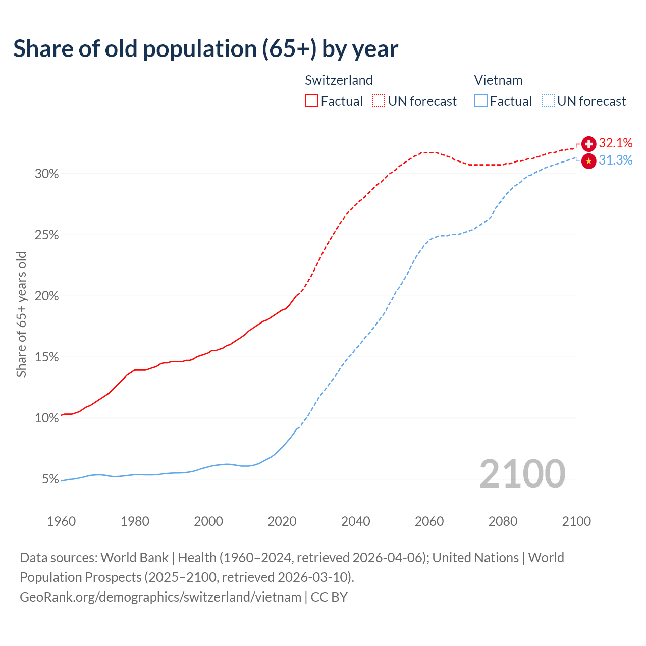 The share of older people aged 65 and over is 20% in Switzerland and 9.05% in Vietnam. Life expectancy in Switzerland compared to Vietnam .