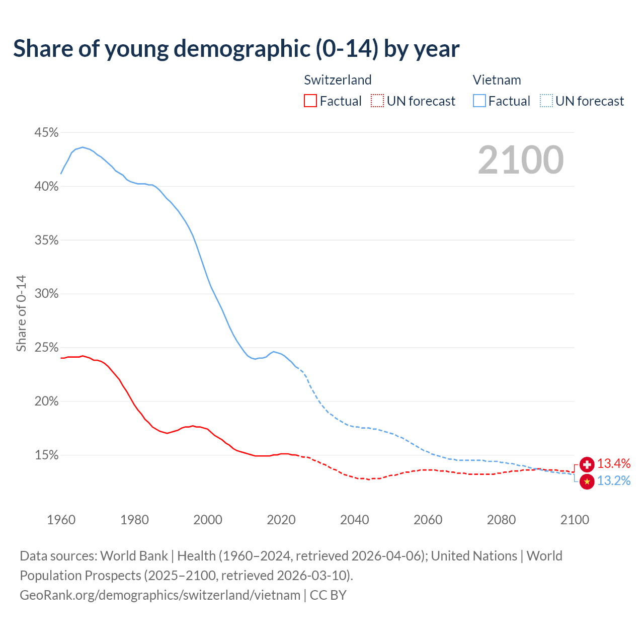 - The share of young demographic (0-15 years old) in Switzerland is 15% vs 23.2% in Vietnam.
