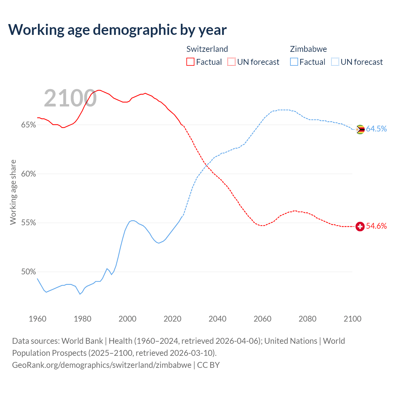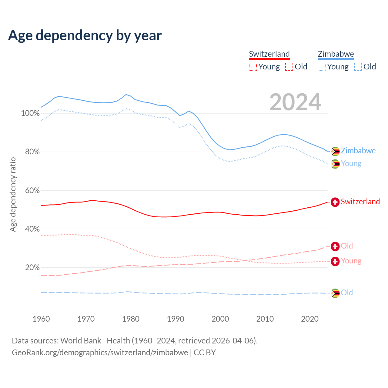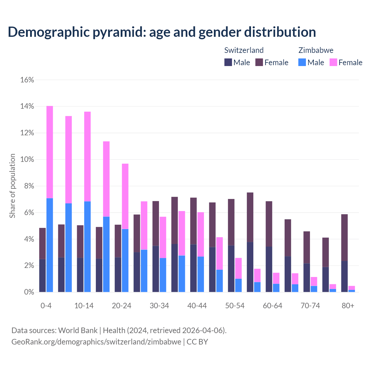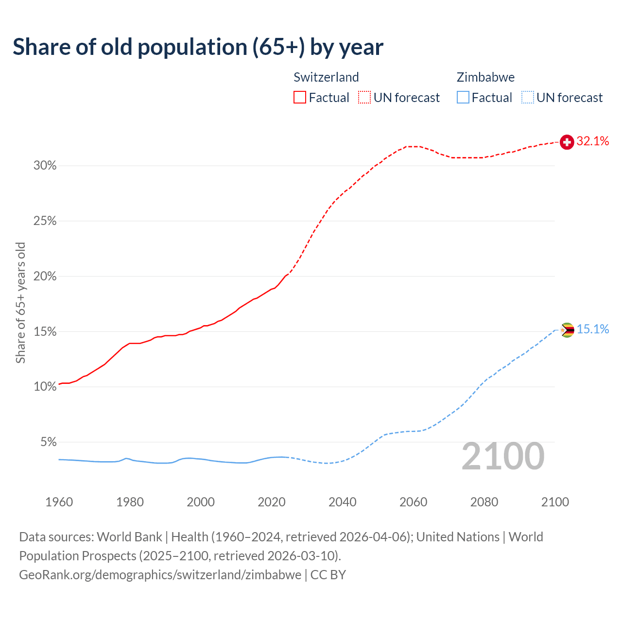 The share of older people aged 65 and over is 20% in Switzerland and 3.6% in Zimbabwe. Life expectancy in Switzerland compared to Zimbabwe .