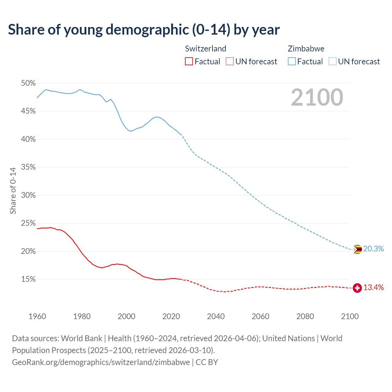 - The share of young demographic (0-15 years old) in Switzerland is 15% vs 40.9% in Zimbabwe.