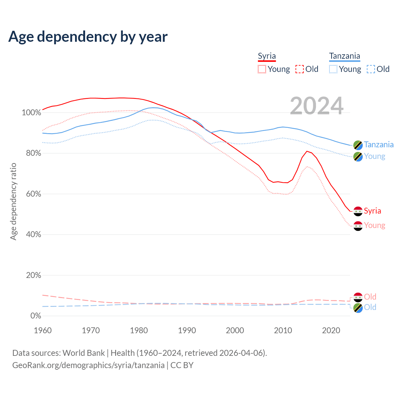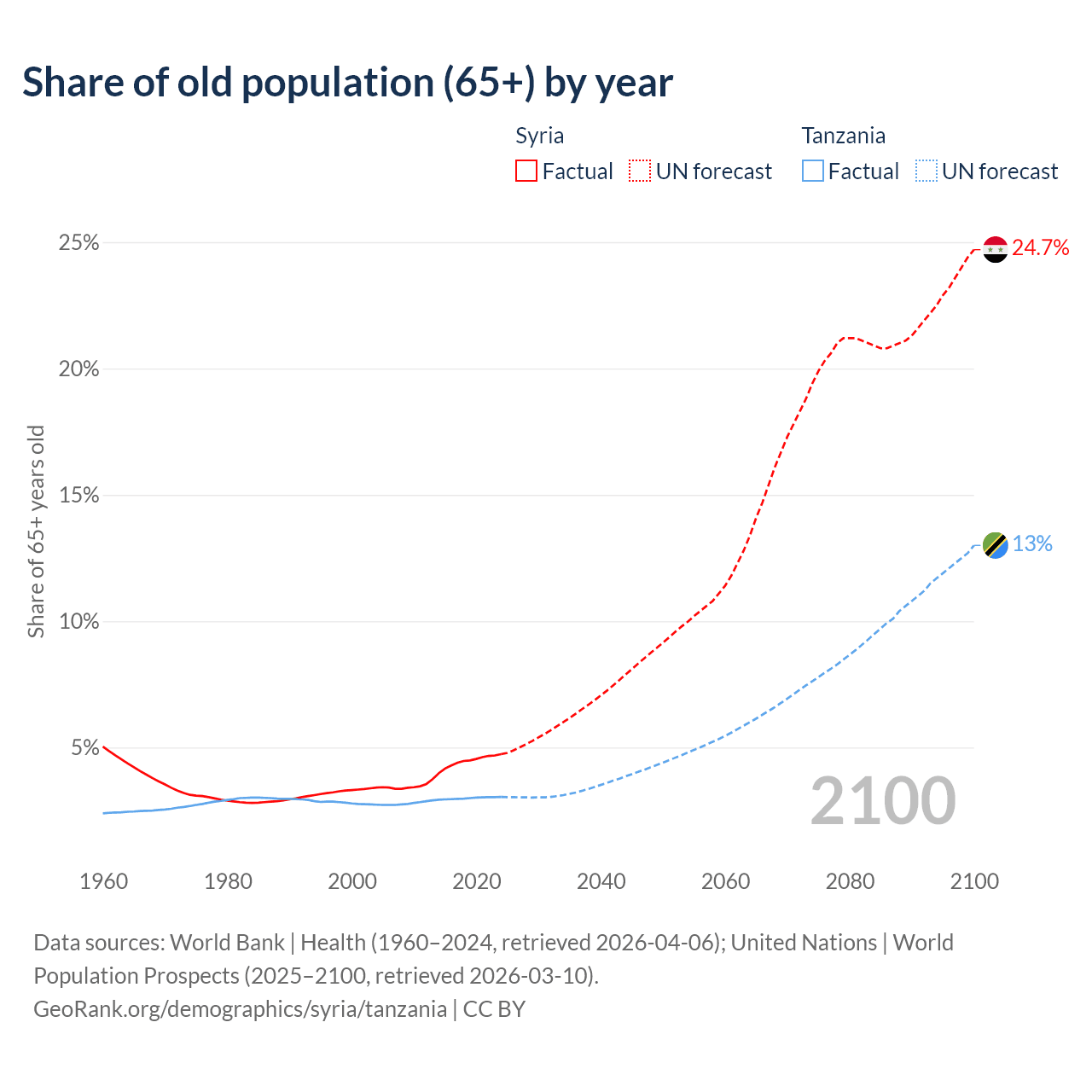 - The share of old-age demographic (65+) in Syria is 4.74% vs 3.05% in Tanzania.