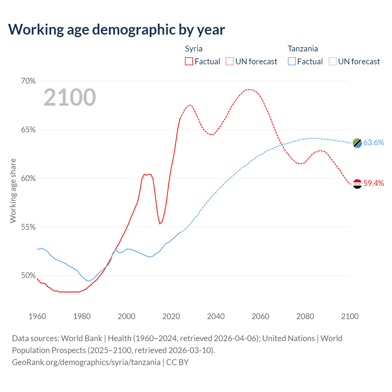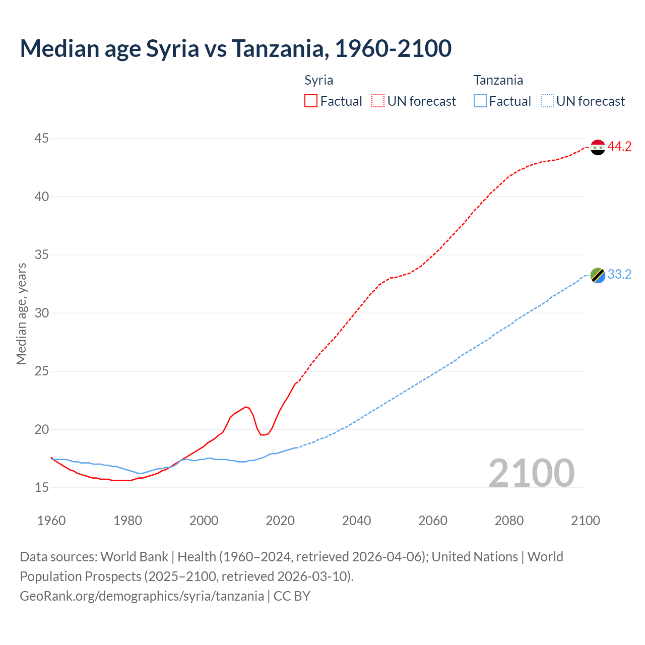 Median age Syria vs Tanzania, 1960-2100