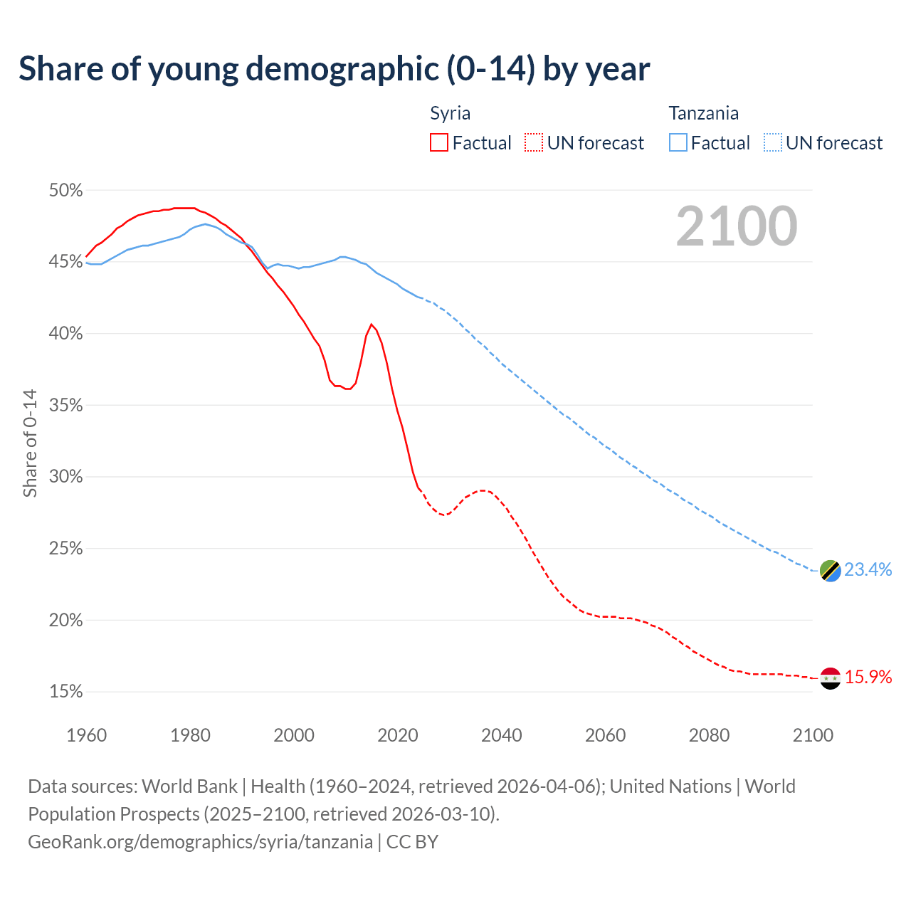 - The share of young demographic (0-15 years old) in Syria is 29.2% vs 42.5% in Tanzania.
