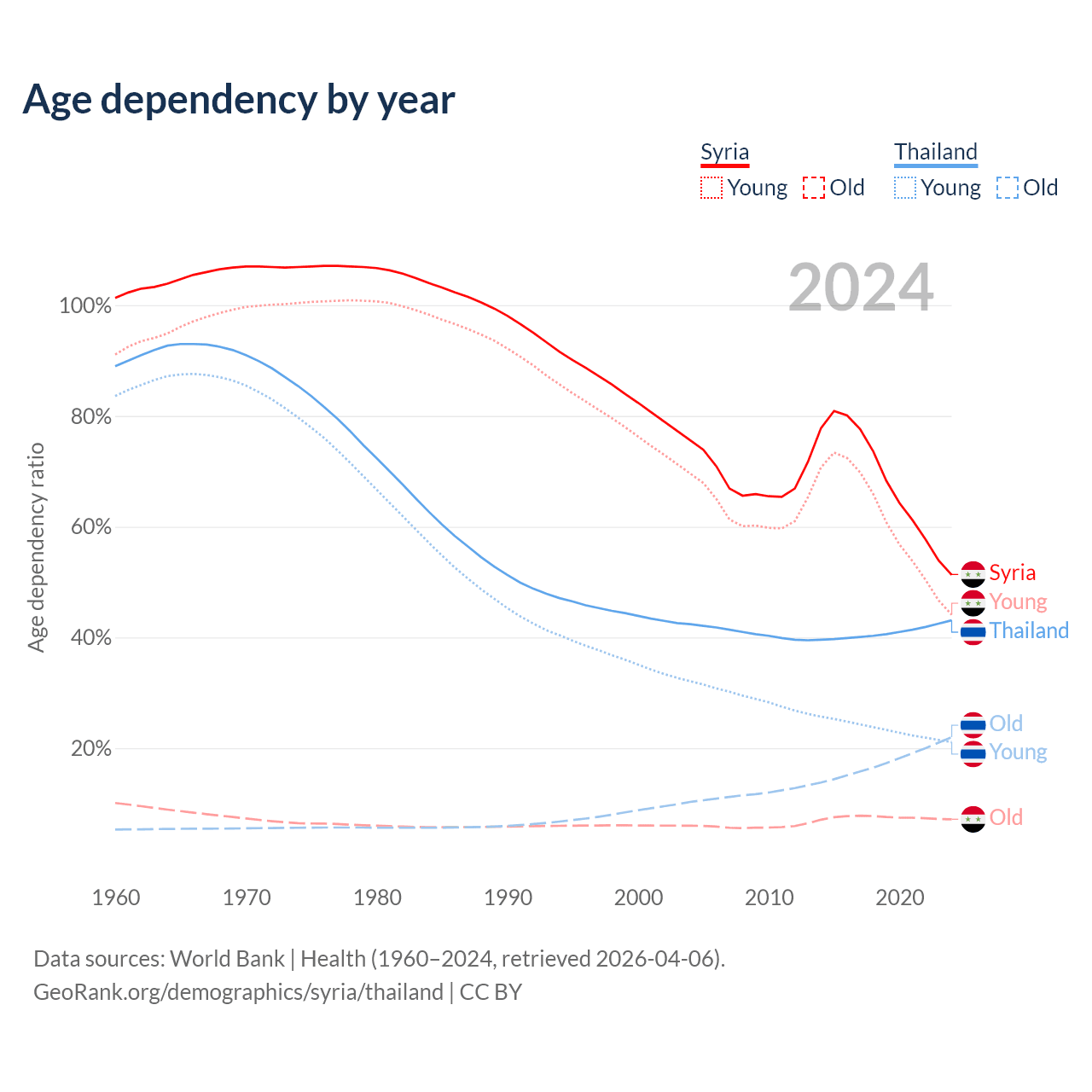 - The share of old-age demographic (65+) in Syria is 4.74% vs 15.4% in Thailand.