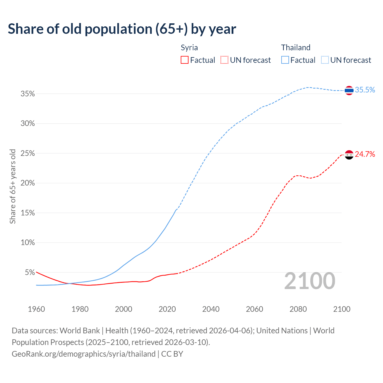 The share of older people aged 65 and over is 4.74% in Syria and 15.4% in Thailand. Life expectancy in Syria compared to Thailand .