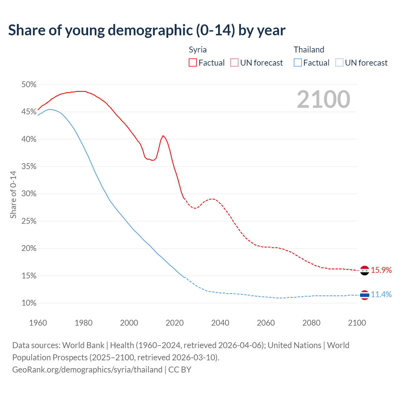 - The share of young demographic (0-15 years old) in Syria is 29.2% vs 14.7% in Thailand.