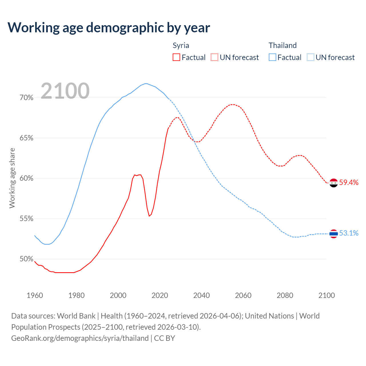 Median age Syria vs Thailand, 1960-2100