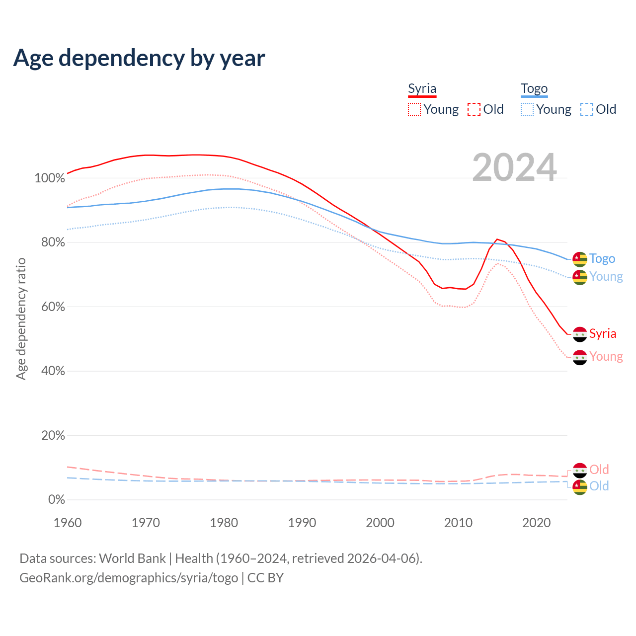 - The share of old-age demographic (65+) in Syria is 4.74% vs 3.21% in Togo.