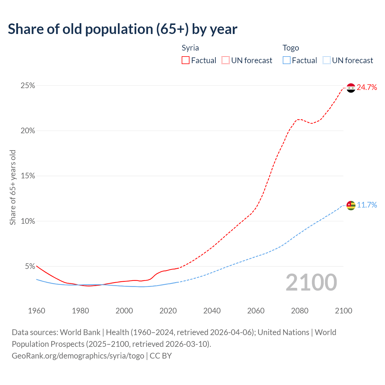 The share of older people aged 65 and over is 4.74% in Syria and 3.21% in Togo. Life expectancy in Syria compared to Togo .