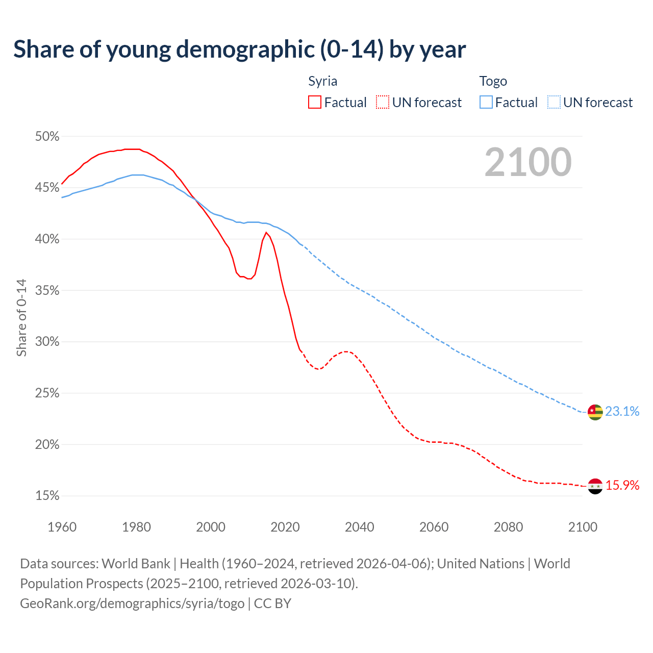 - The share of young demographic (0-15 years old) in Syria is 29.2% vs 39.5% in Togo.