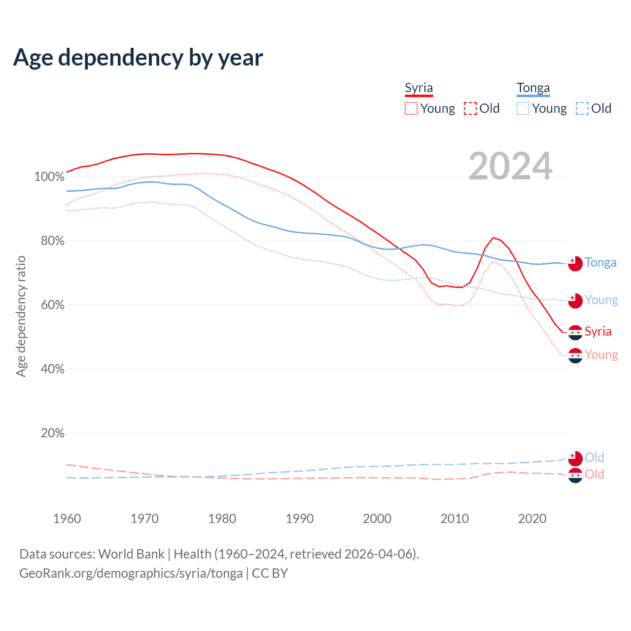 - The share of old-age demographic (65+) in Syria is 4.74% vs 6.72% in Tonga.