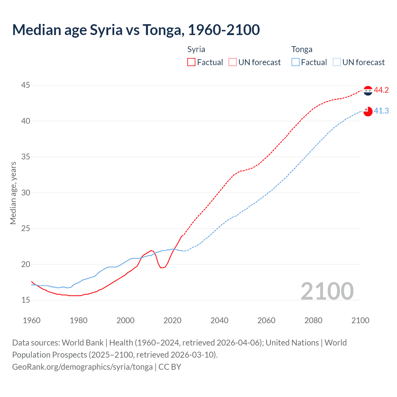 Median age Syria vs Tonga, 1960-2100