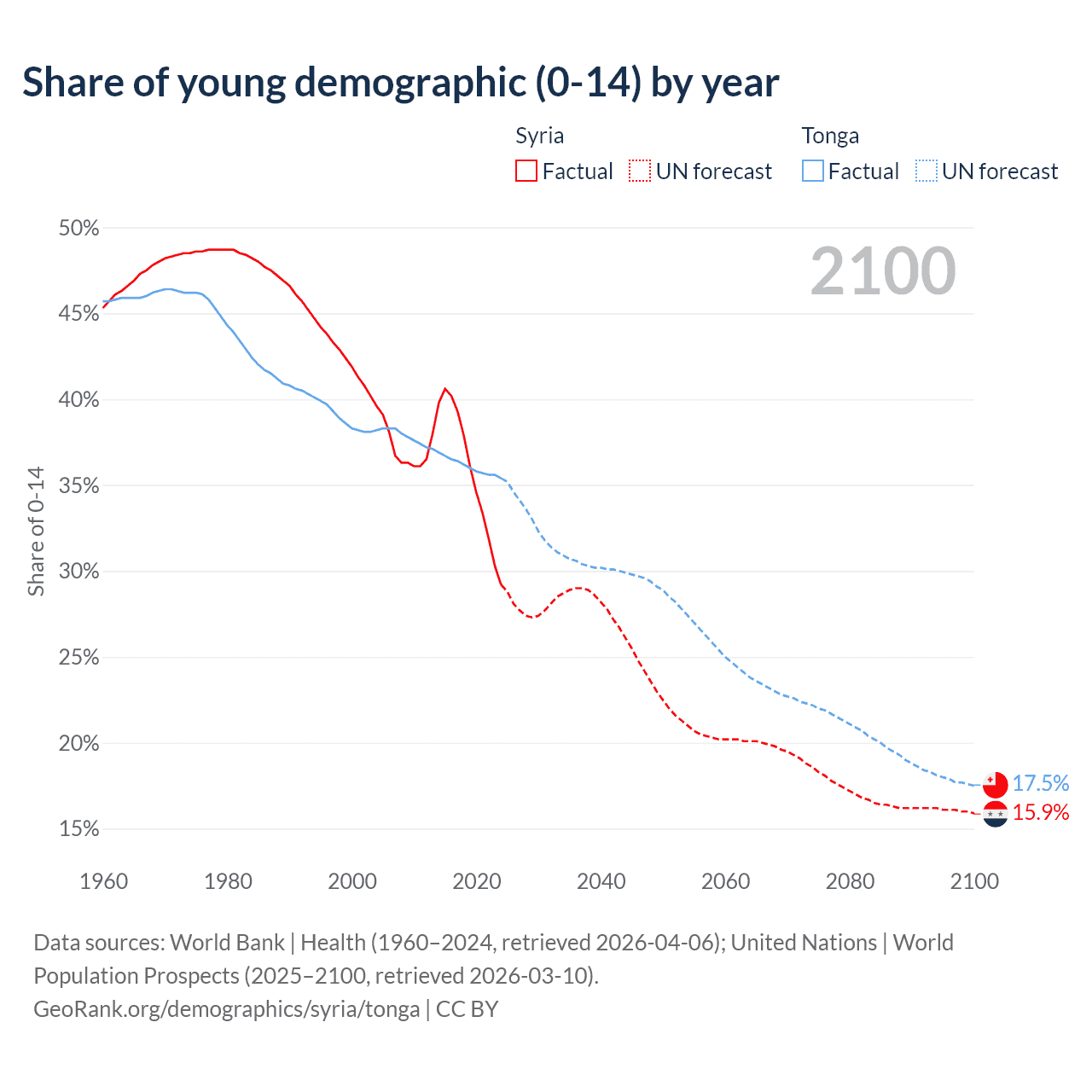 - The share of young demographic (0-15 years old) in Syria is 29.2% vs 35.4% in Tonga.