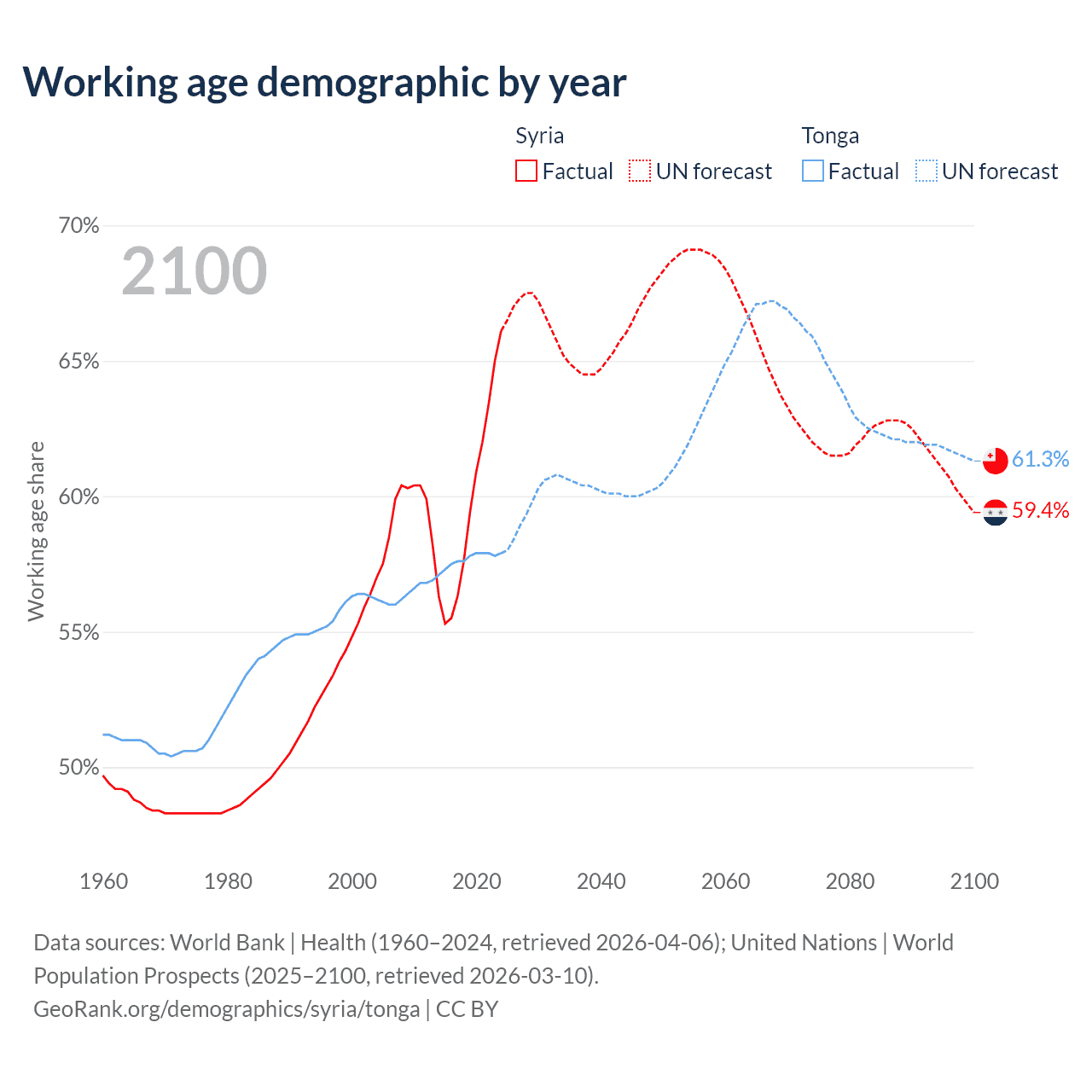 - Syria has 17.7M working age adults (aged 15-64) vs 59.8K in Tonga.