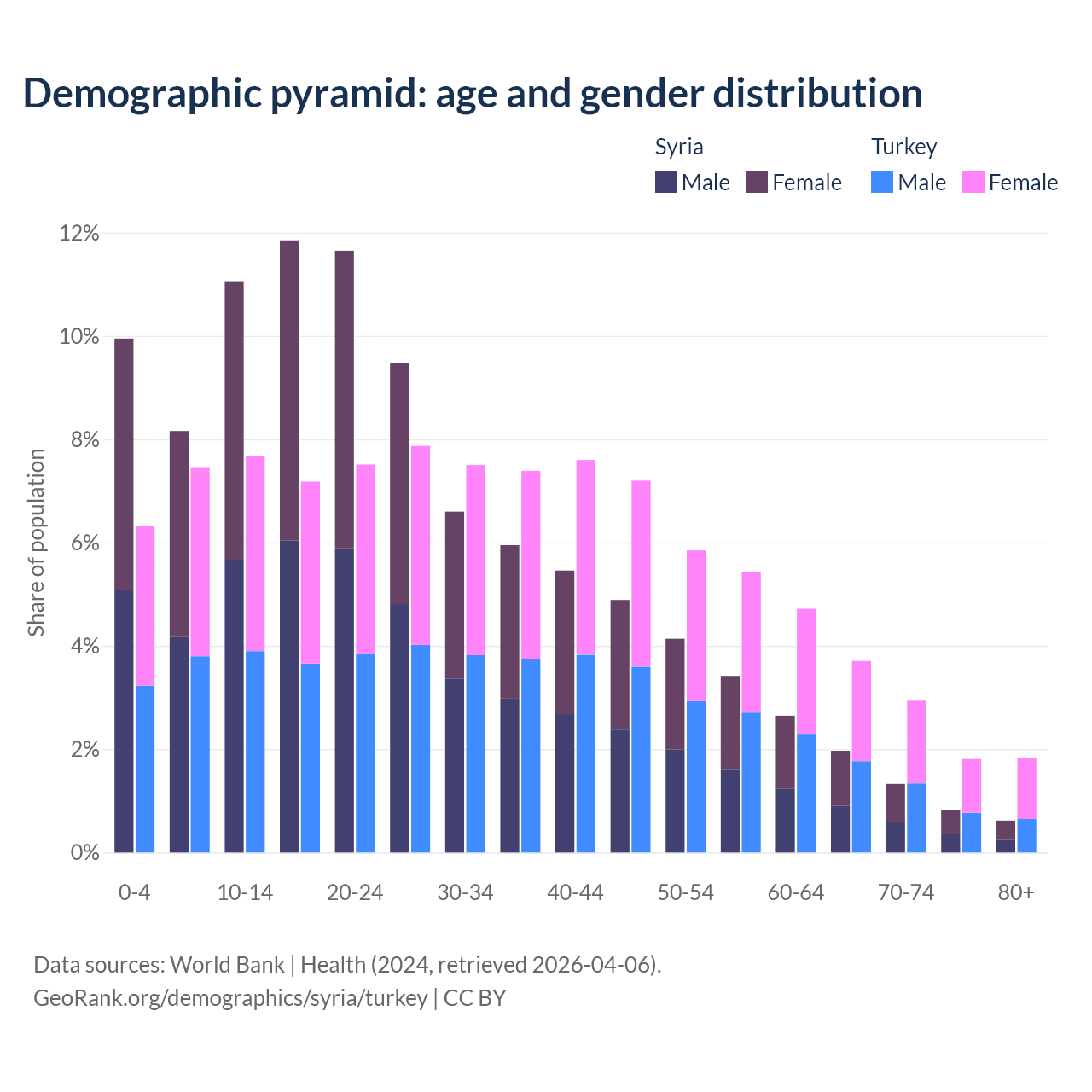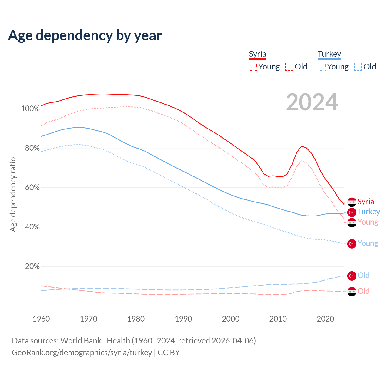 - Syria is ranked 138/196 by median age (oldest to youngest) vs 83/196 for Turkey.