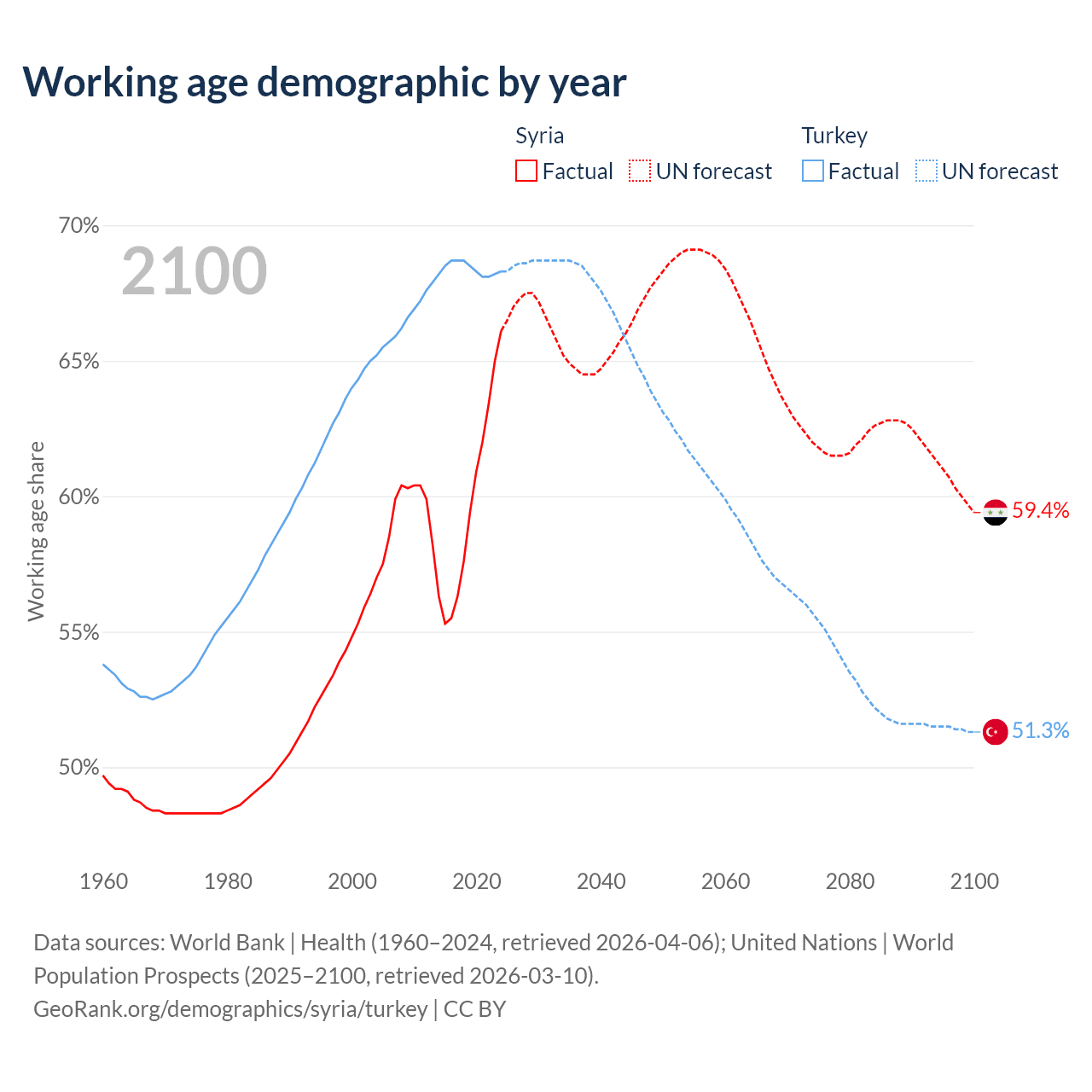 - Syria has 17.7M working age adults (aged 15-64) vs 58.7M in Turkey.