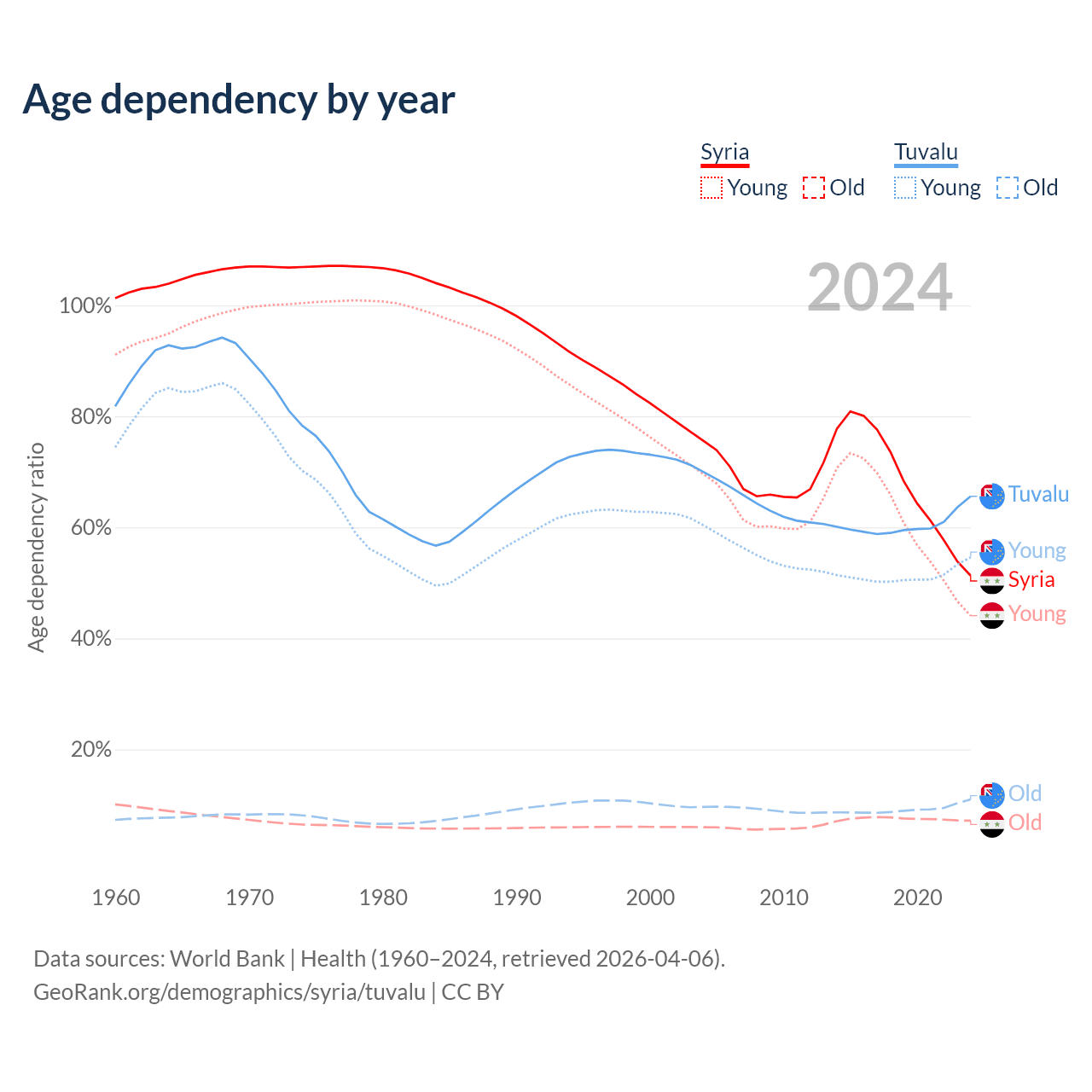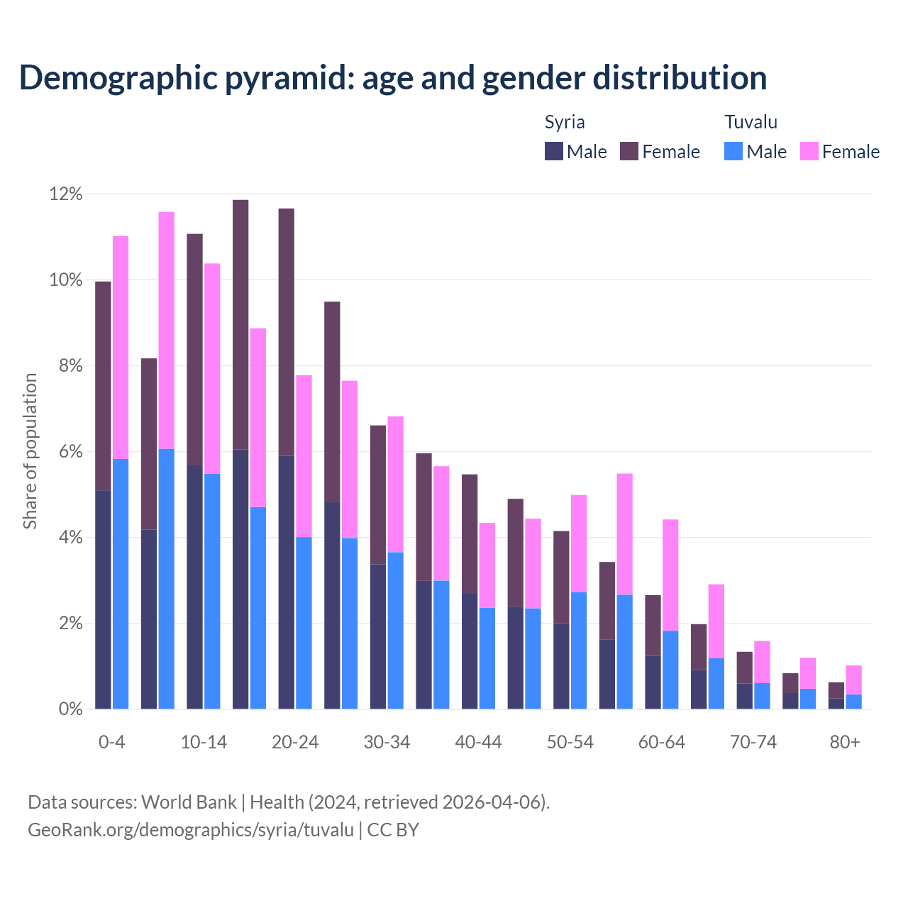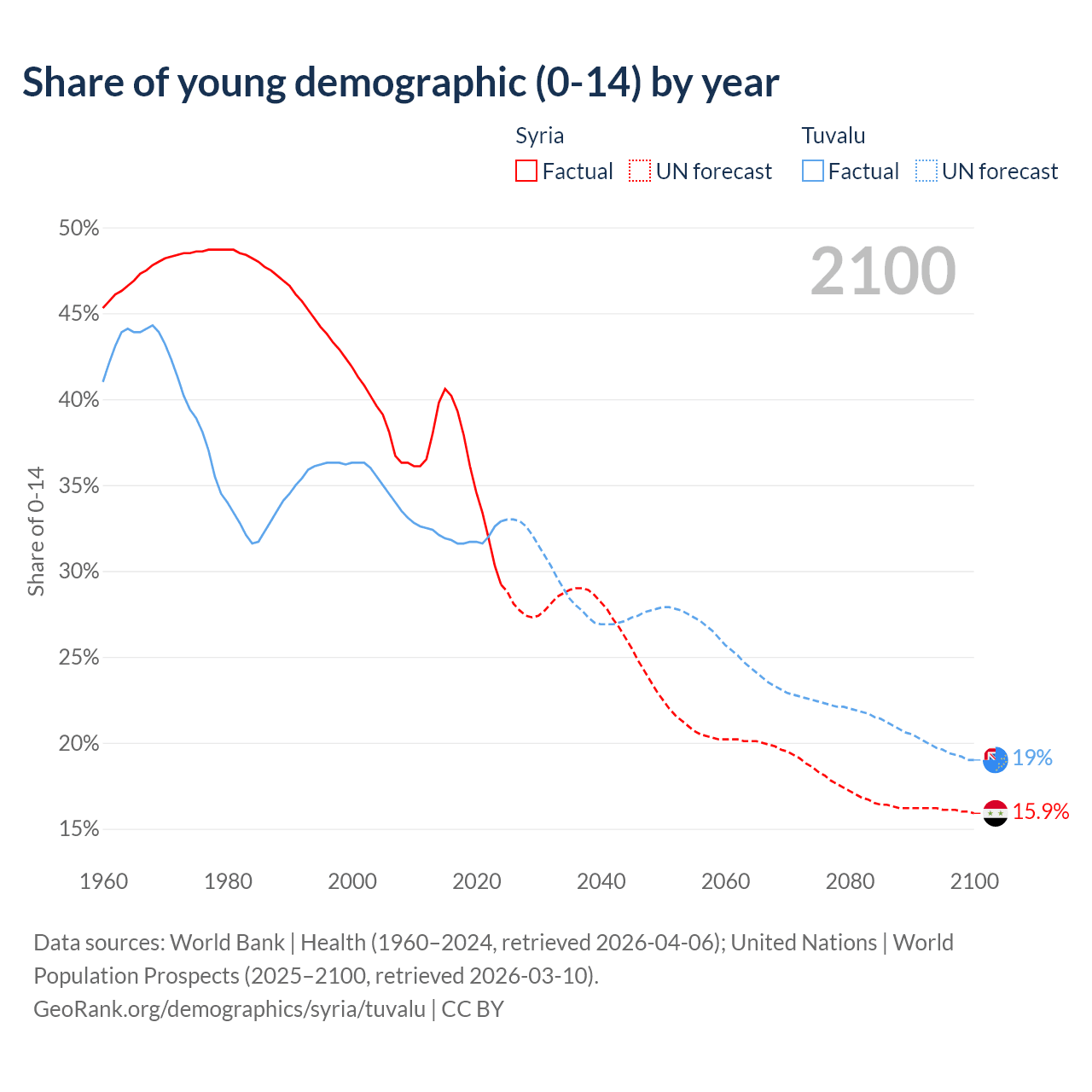 - The share of young demographic (0-15 years old) in Syria is 29.2% vs 32.9% in Tuvalu.