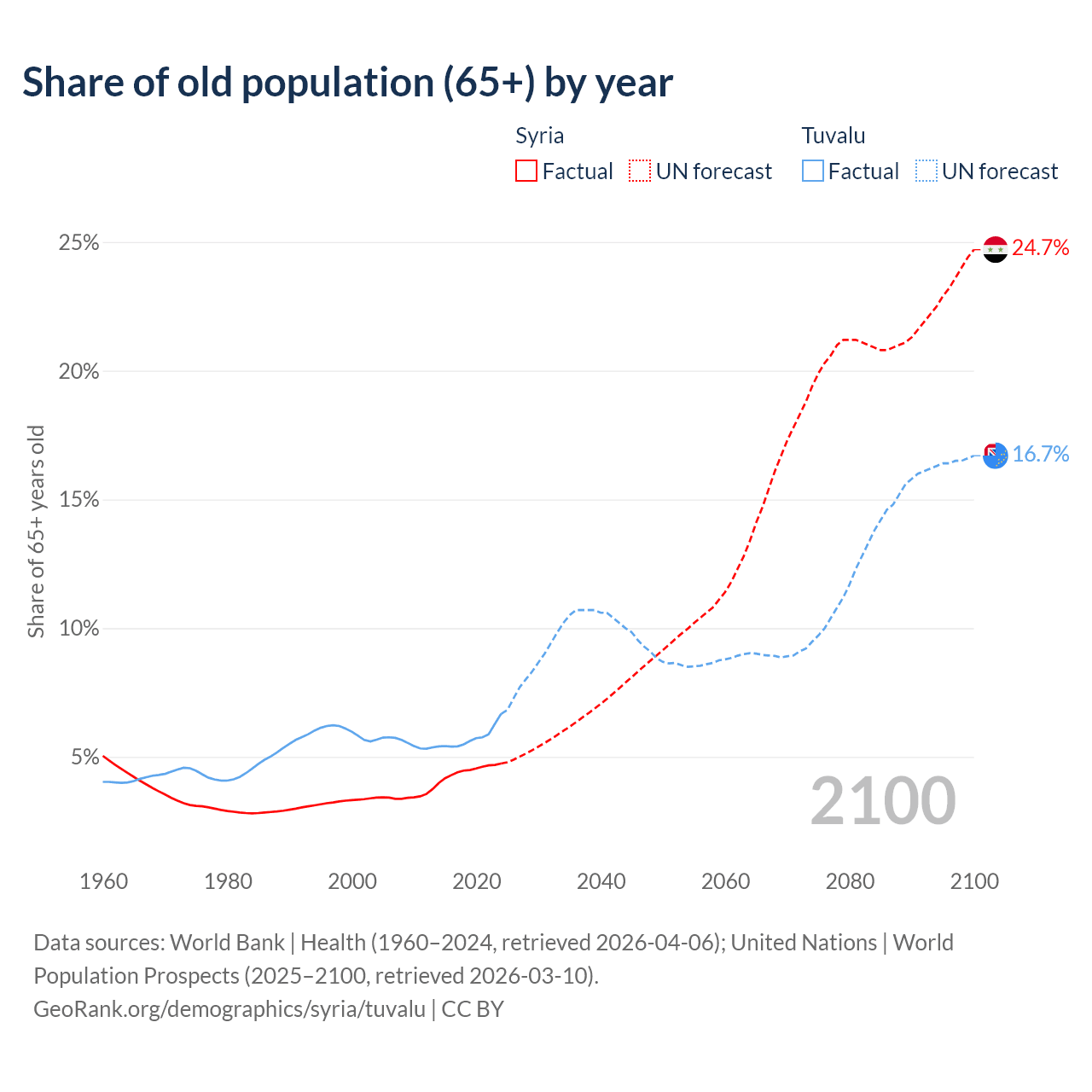The share of older people aged 65 and over is 4.74% in Syria and 6.67% in Tuvalu. Life expectancy in Syria compared to Tuvalu .