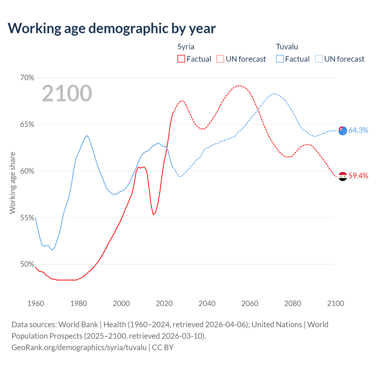 - Syria has 17.7M working age adults (aged 15-64) vs 5.64K in Tuvalu.