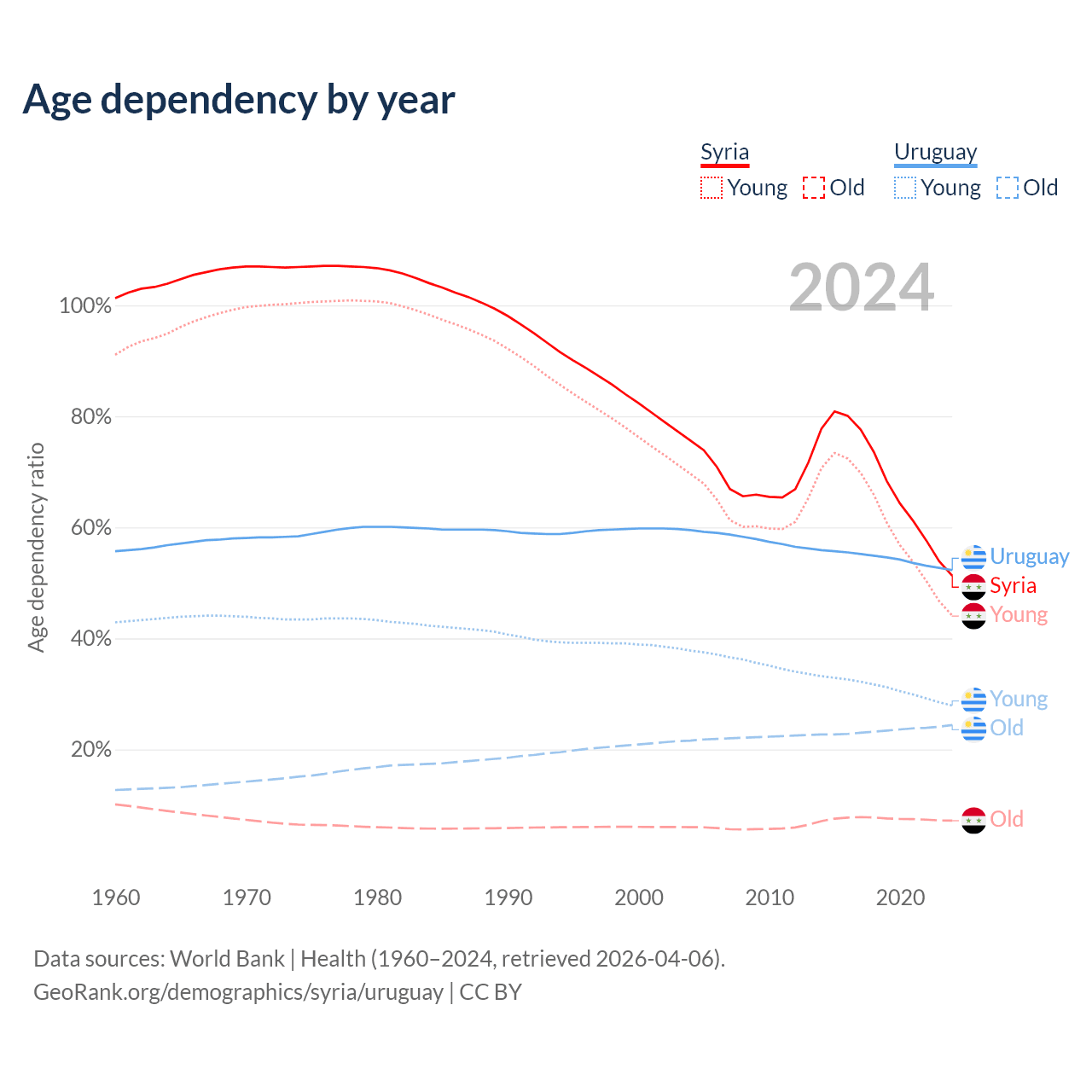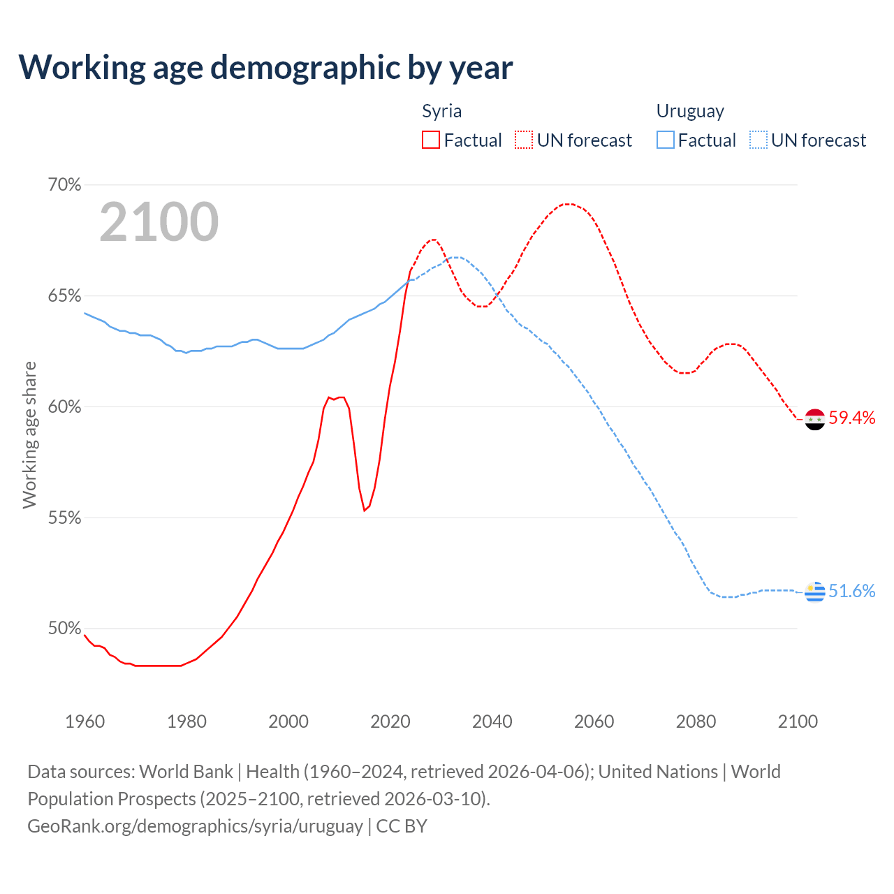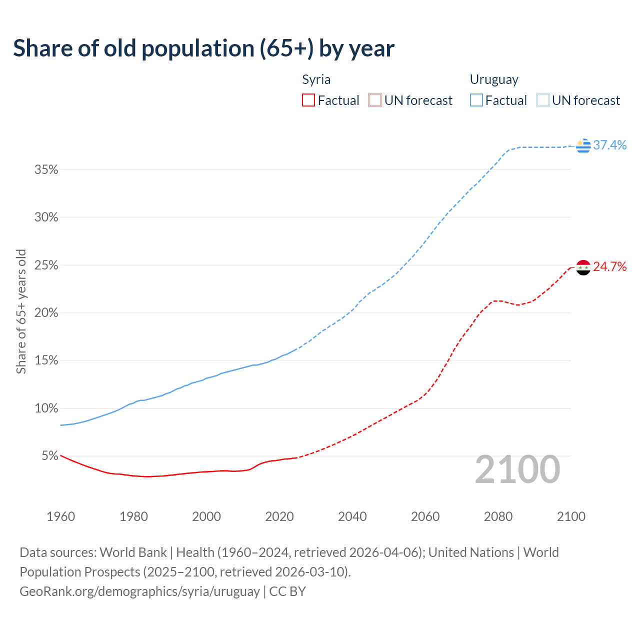The share of older people aged 65 and over is 4.74% in Syria and 16% in Uruguay. Life expectancy in Syria compared to Uruguay .