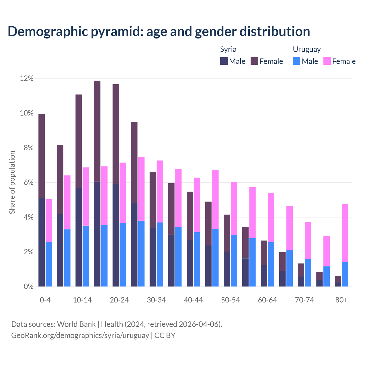 - Syria is ranked 138/196 by median age (oldest to youngest) vs 63/196 for Uruguay.