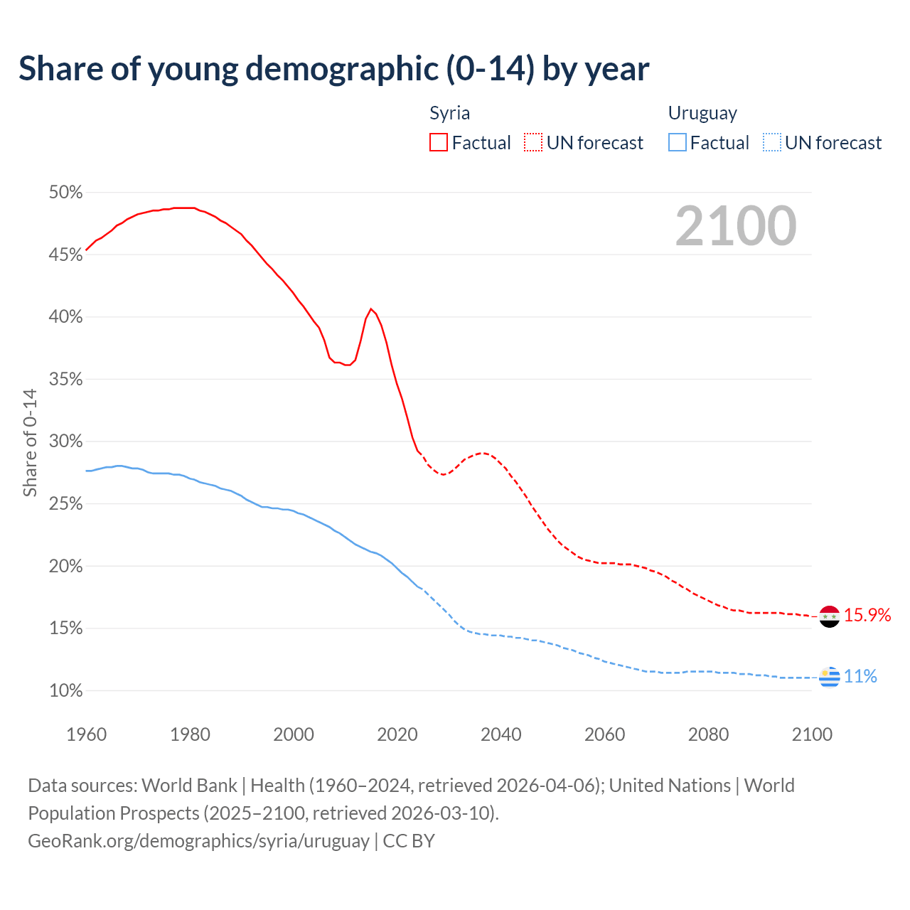 - The share of young demographic (0-15 years old) in Syria is 29.2% vs 18.3% in Uruguay.