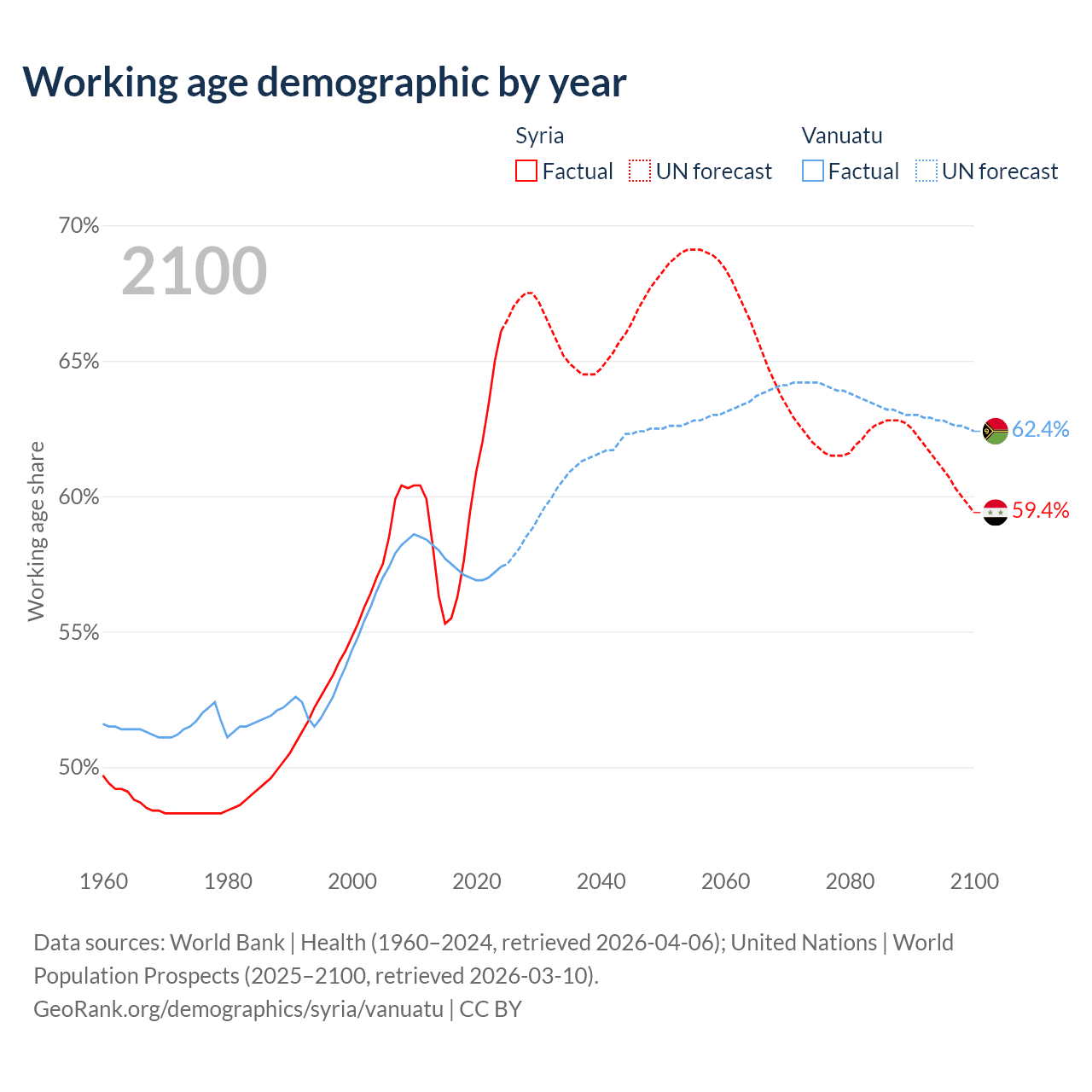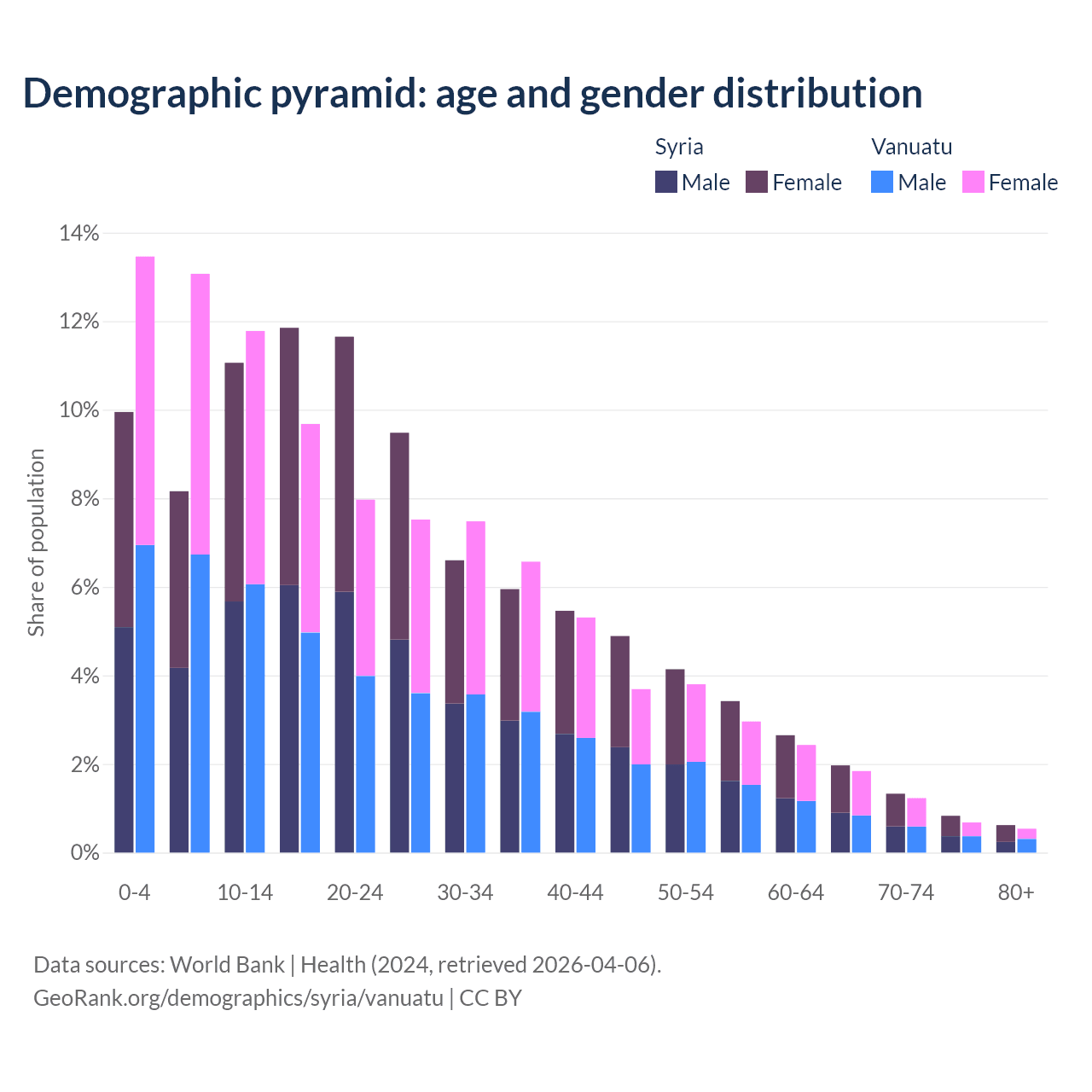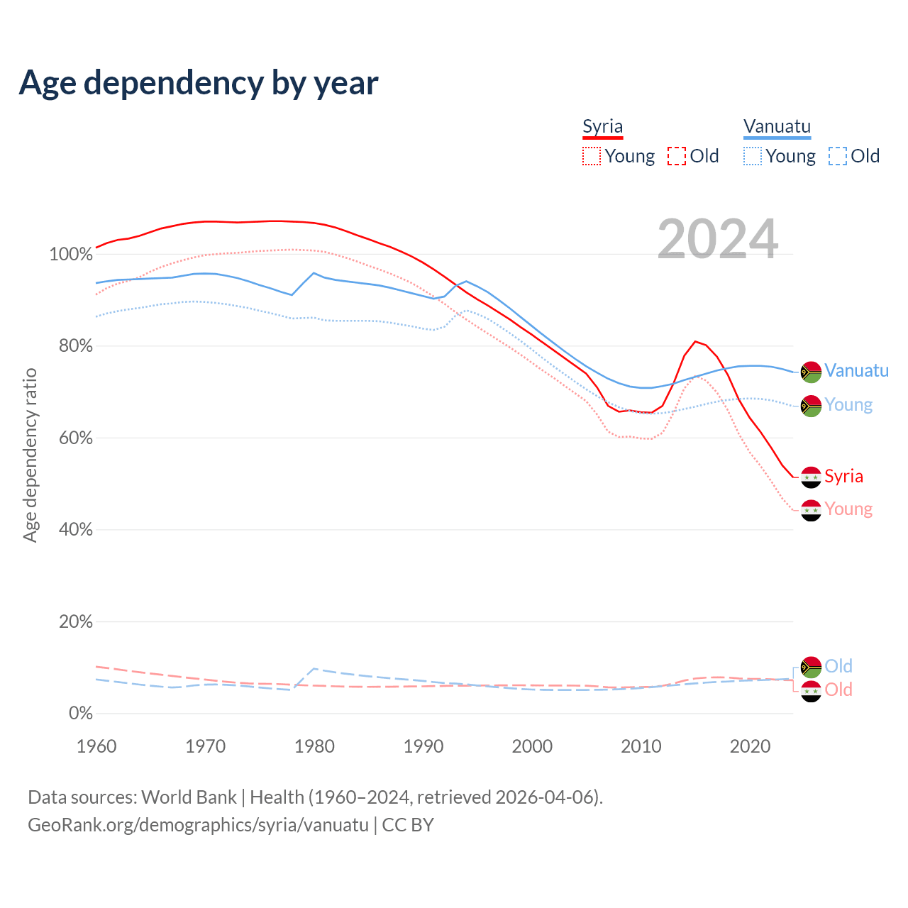 - The share of old-age demographic (65+) in Syria is 4.74% vs 4.3% in Vanuatu.