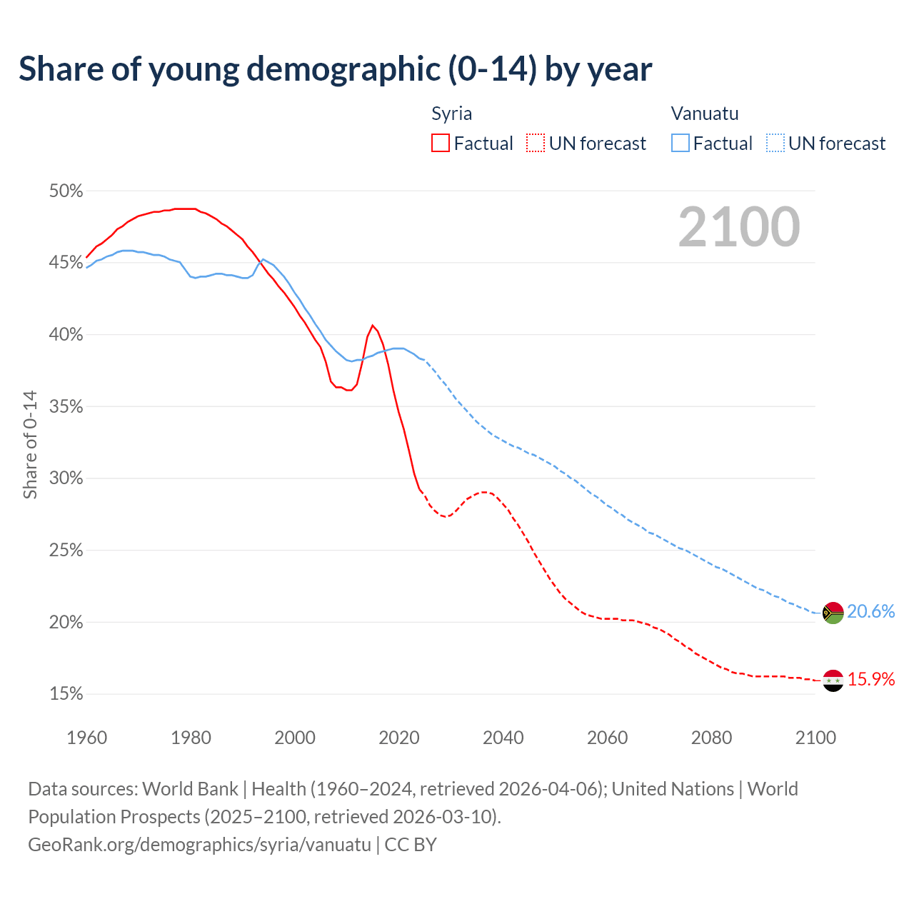 - The share of young demographic (0-15 years old) in Syria is 29.2% vs 38.3% in Vanuatu.