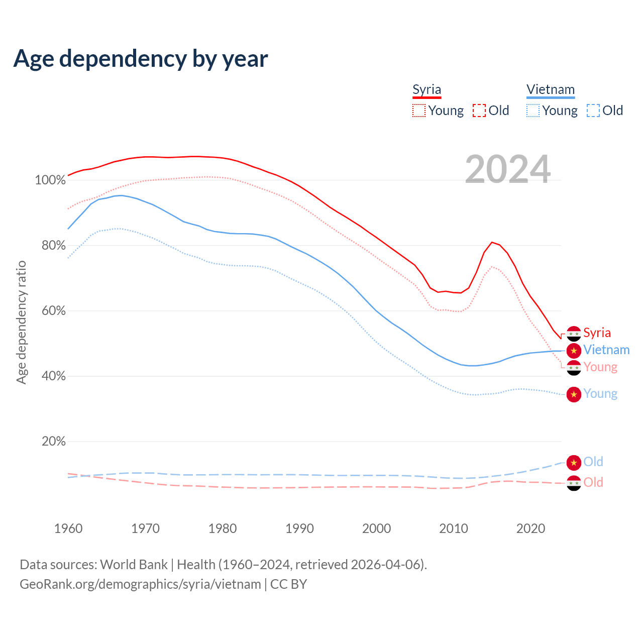 - Syria is ranked 138/196 by median age (oldest to youngest) vs 84/196 for Vietnam.