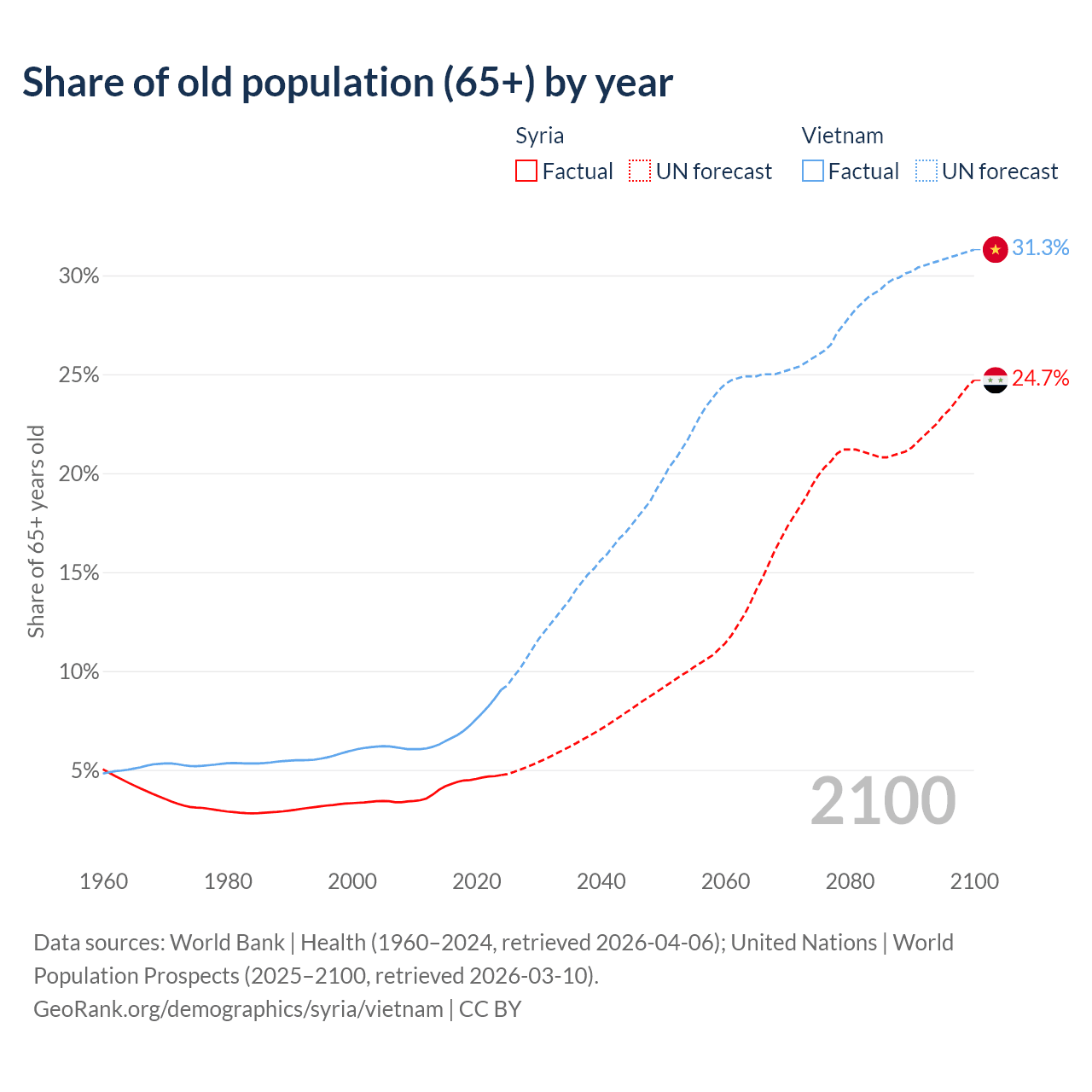 The share of older people aged 65 and over is 4.74% in Syria and 9.05% in Vietnam. Life expectancy in Syria compared to Vietnam .