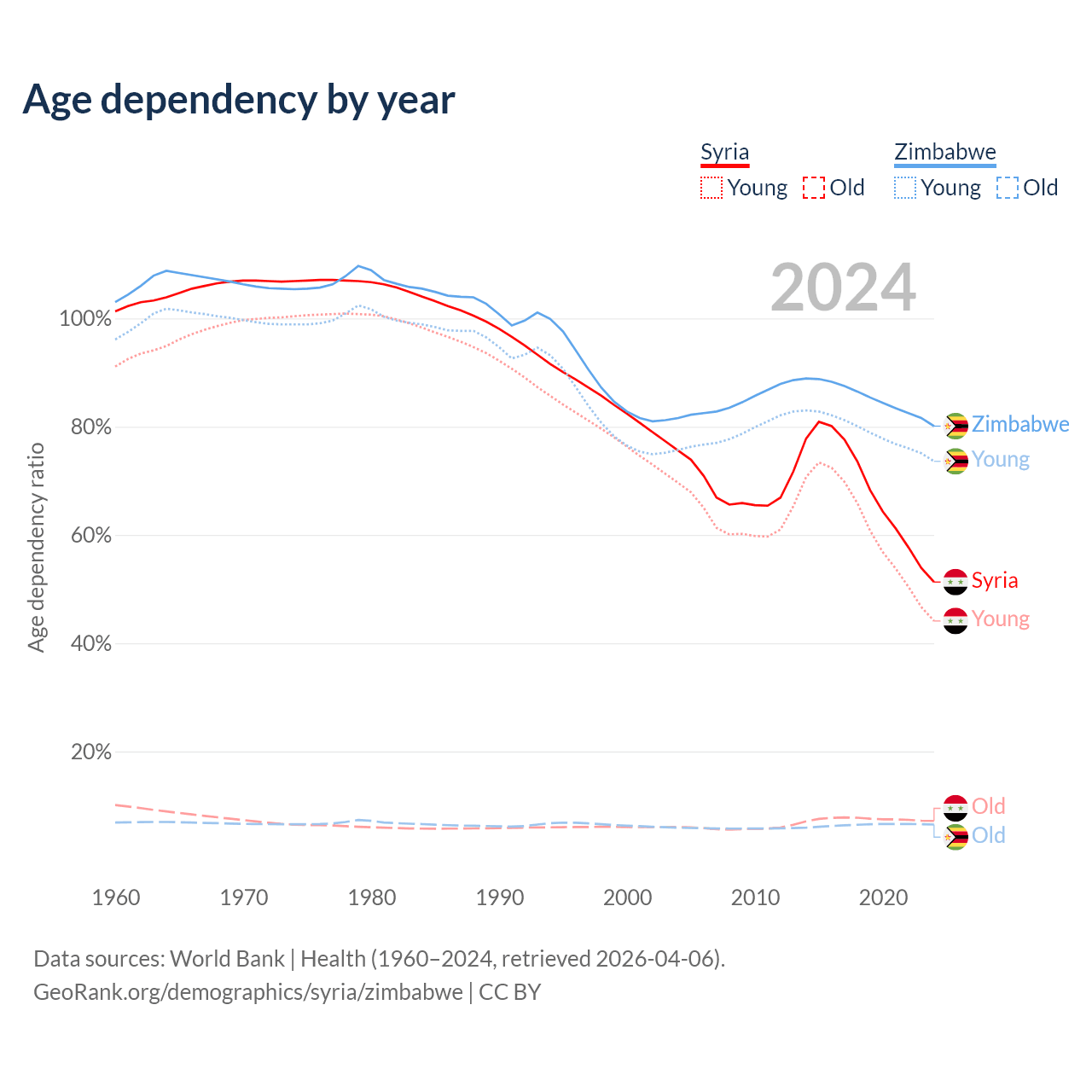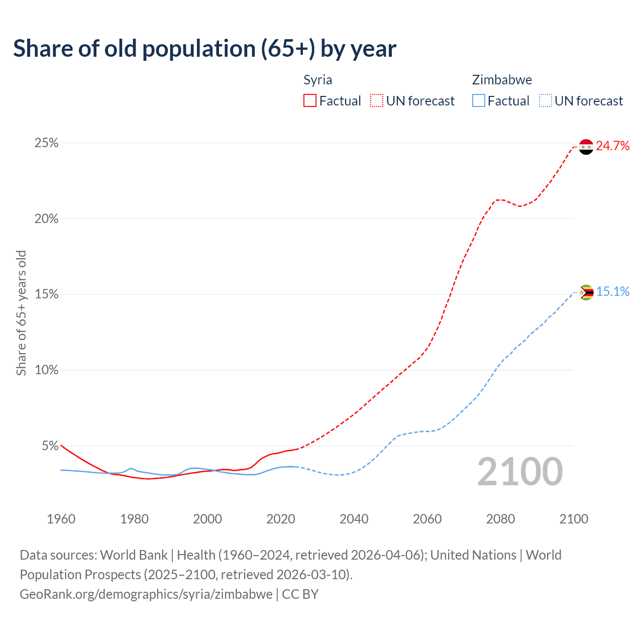 The share of older people aged 65 and over is 4.74% in Syria and 3.6% in Zimbabwe. Life expectancy in Syria compared to Zimbabwe .