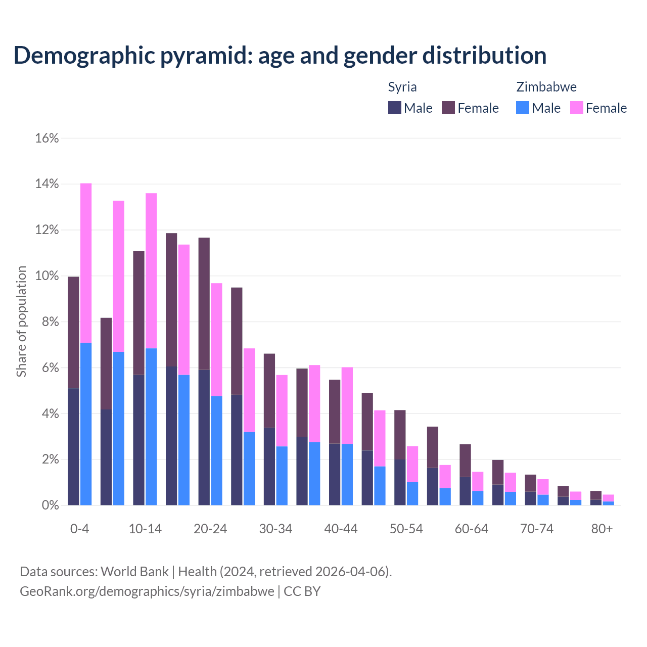 - As of 2026, the population of Syria is 26.8M vs 17.4M in Zimbabwe - 1.55 times difference.