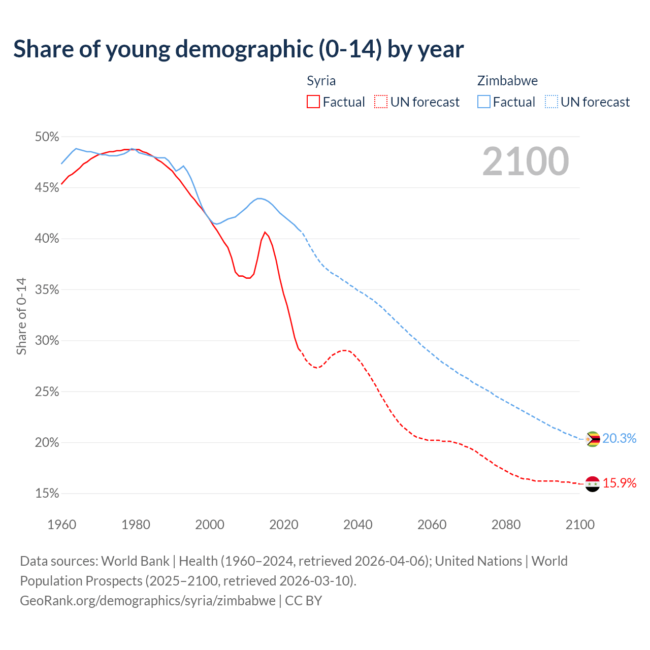 - The share of young demographic (0-15 years old) in Syria is 29.2% vs 40.9% in Zimbabwe.