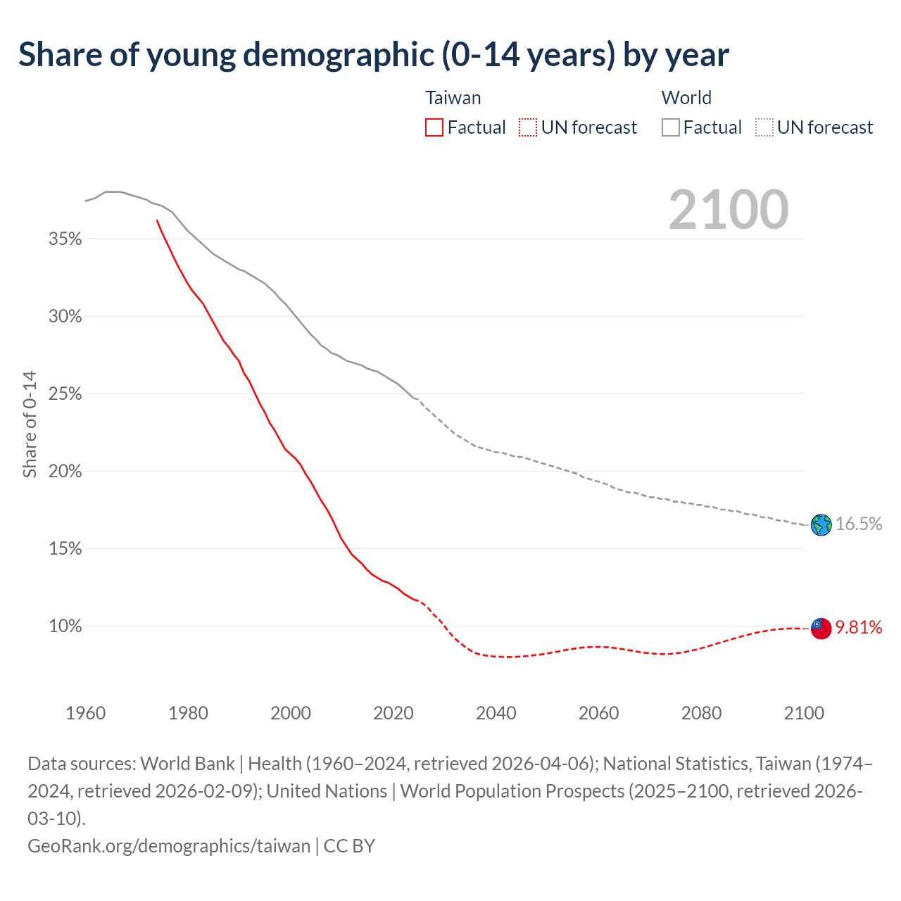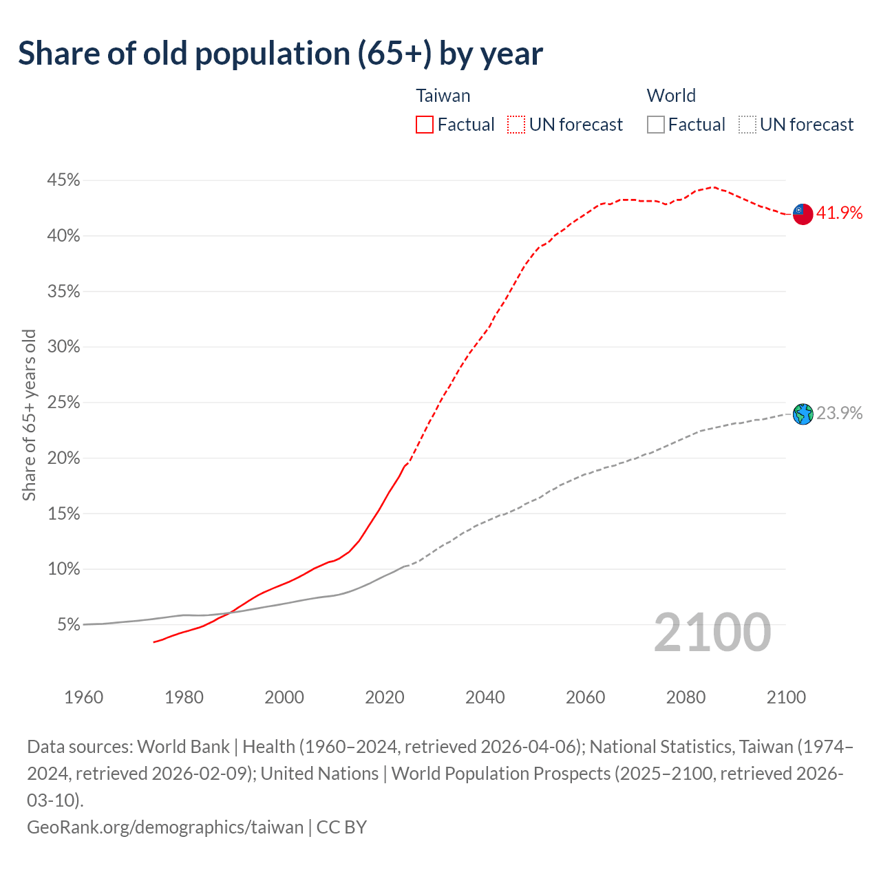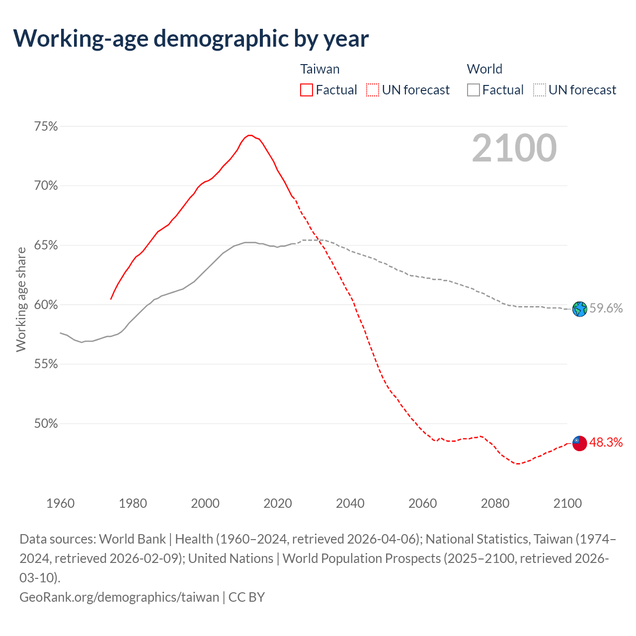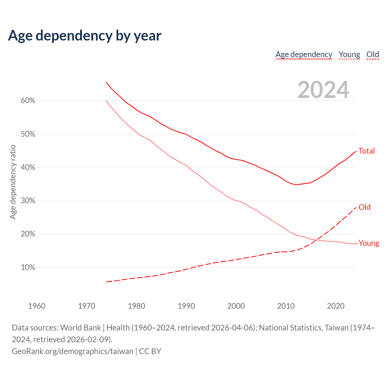 Data sources: World Bank | Health (1960–2024, retrieved 2026-04-06); U.S. Census Bureau (1960–2024, retrieved 2026-02-08); National Statistics, Taiwan (1974–2024, retrieved 2026-02-09).