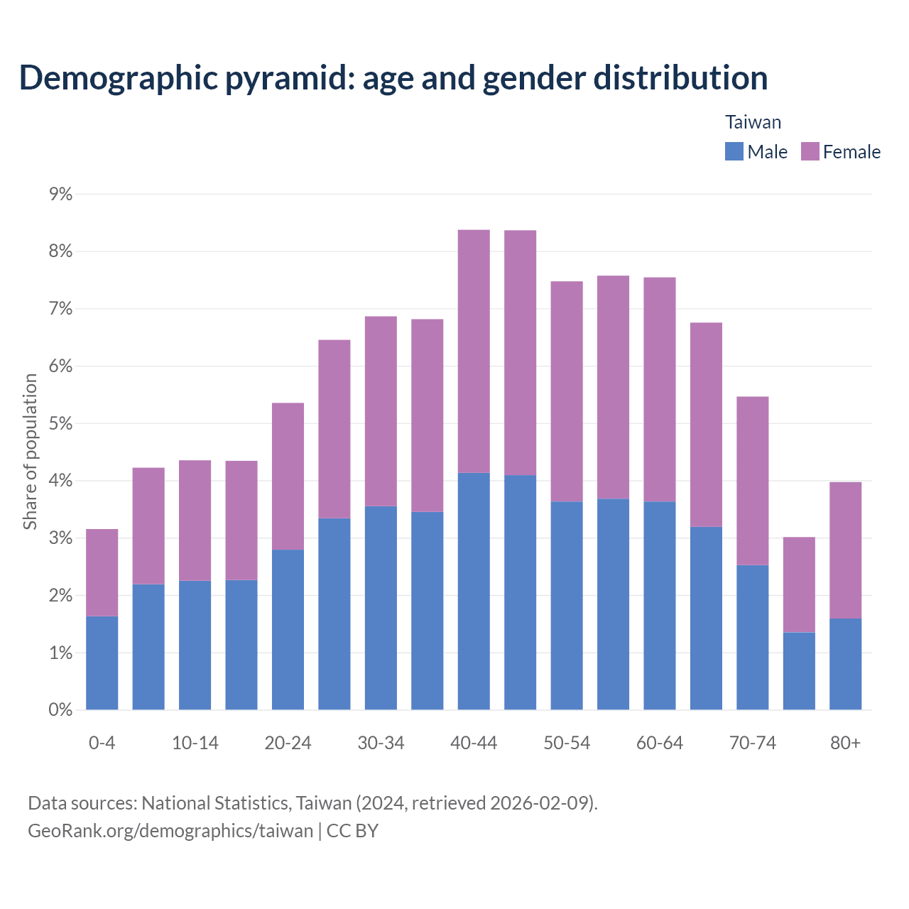 With a population of 23.3M people, Taiwan has a median age of 45.1 years which makes it the 16/196 oldest country. 11.7% of the demographic are children 0-14 years old, 69.1% are working-age people aged 15-64, and 19.2% are older population aged 65+ years.