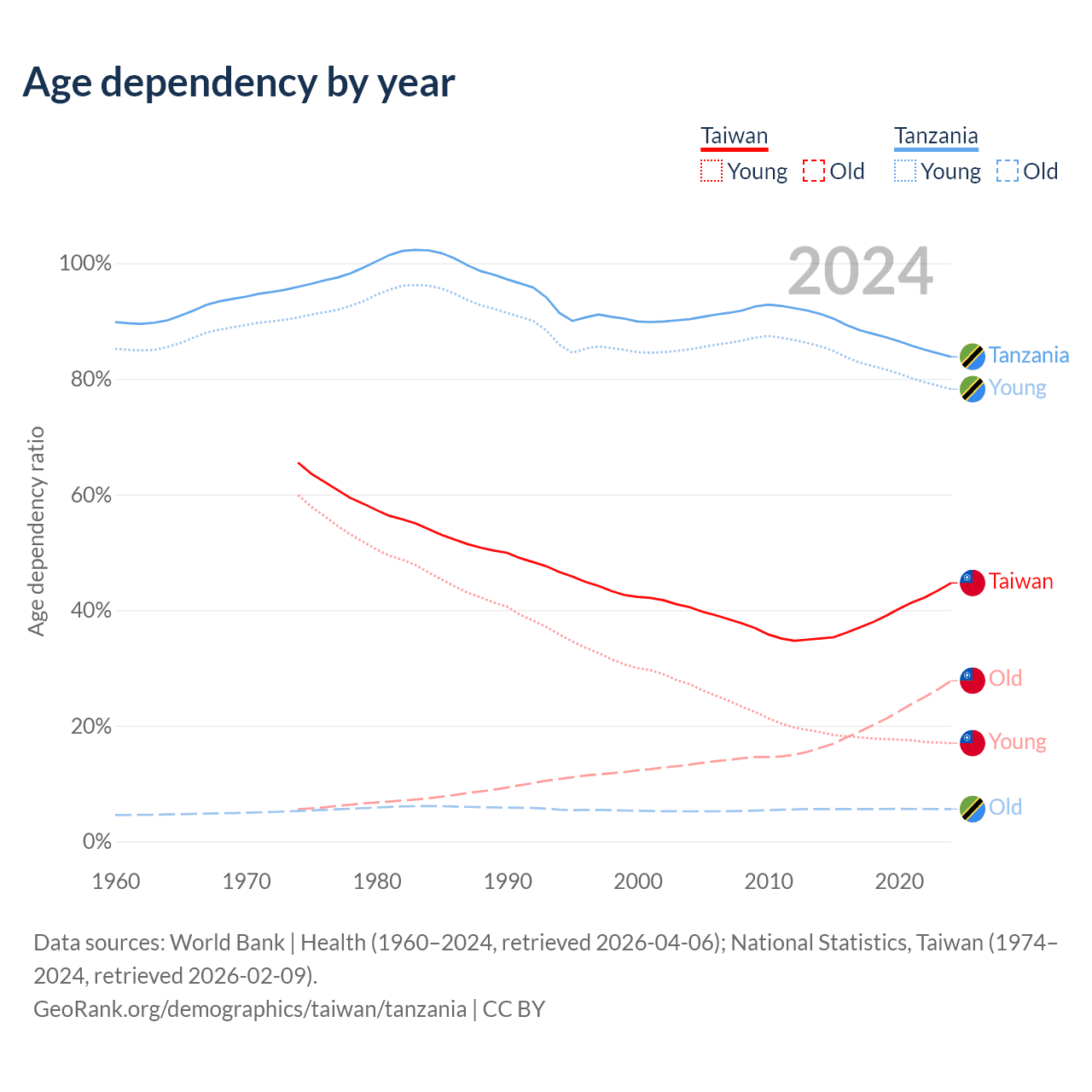 Data sources: World Bank | Health (1960–2024, retrieved 2026-04-06); U.S. Census Bureau (1960–2024, retrieved 2026-02-08); National Statistics, Taiwan (1974–2024, retrieved 2026-02-09).