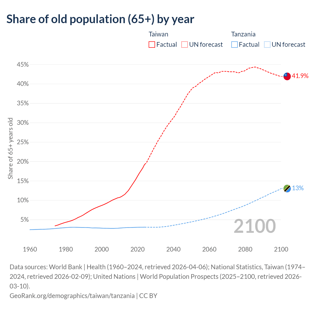 The share of older people aged 65 and over is 19.2% in Taiwan and 3.05% in Tanzania. Life expectancy in Taiwan compared to Tanzania .