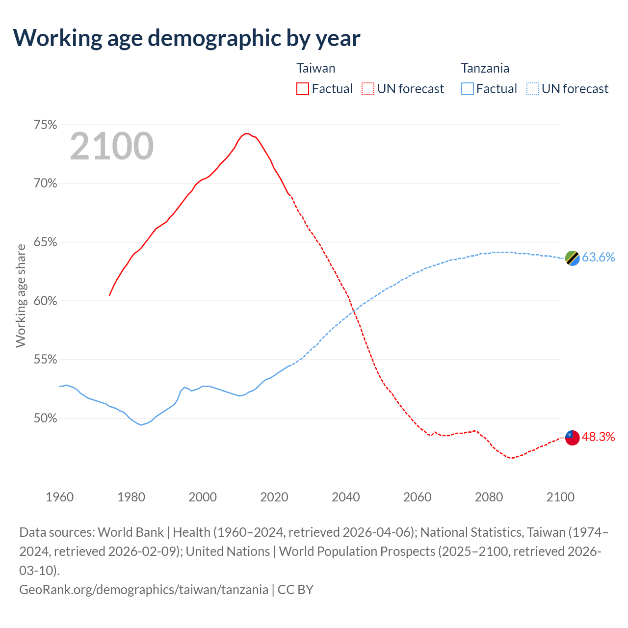 - Taiwan has 16.1M working age adults (aged 15-64) vs 39.8M in Tanzania.