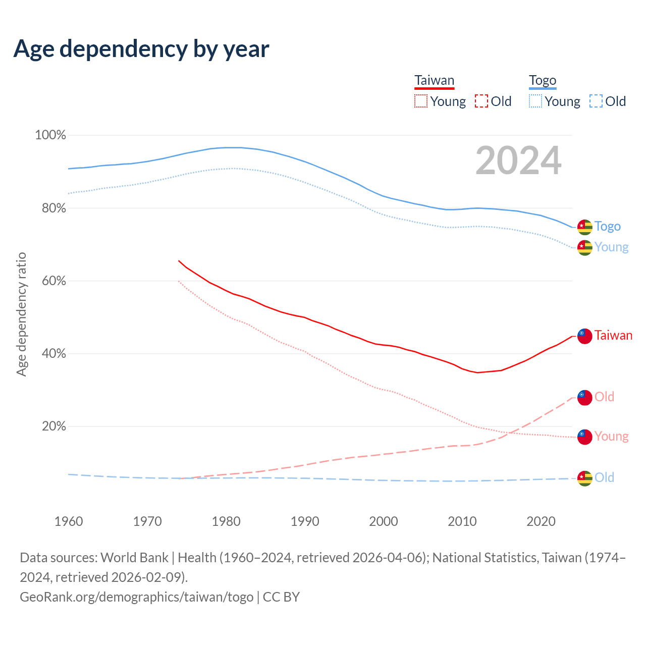 Data sources: World Bank | Health (1960–2024, retrieved 2026-04-06); U.S. Census Bureau (1960–2024, retrieved 2026-02-08); National Statistics, Taiwan (1974–2024, retrieved 2026-02-09).