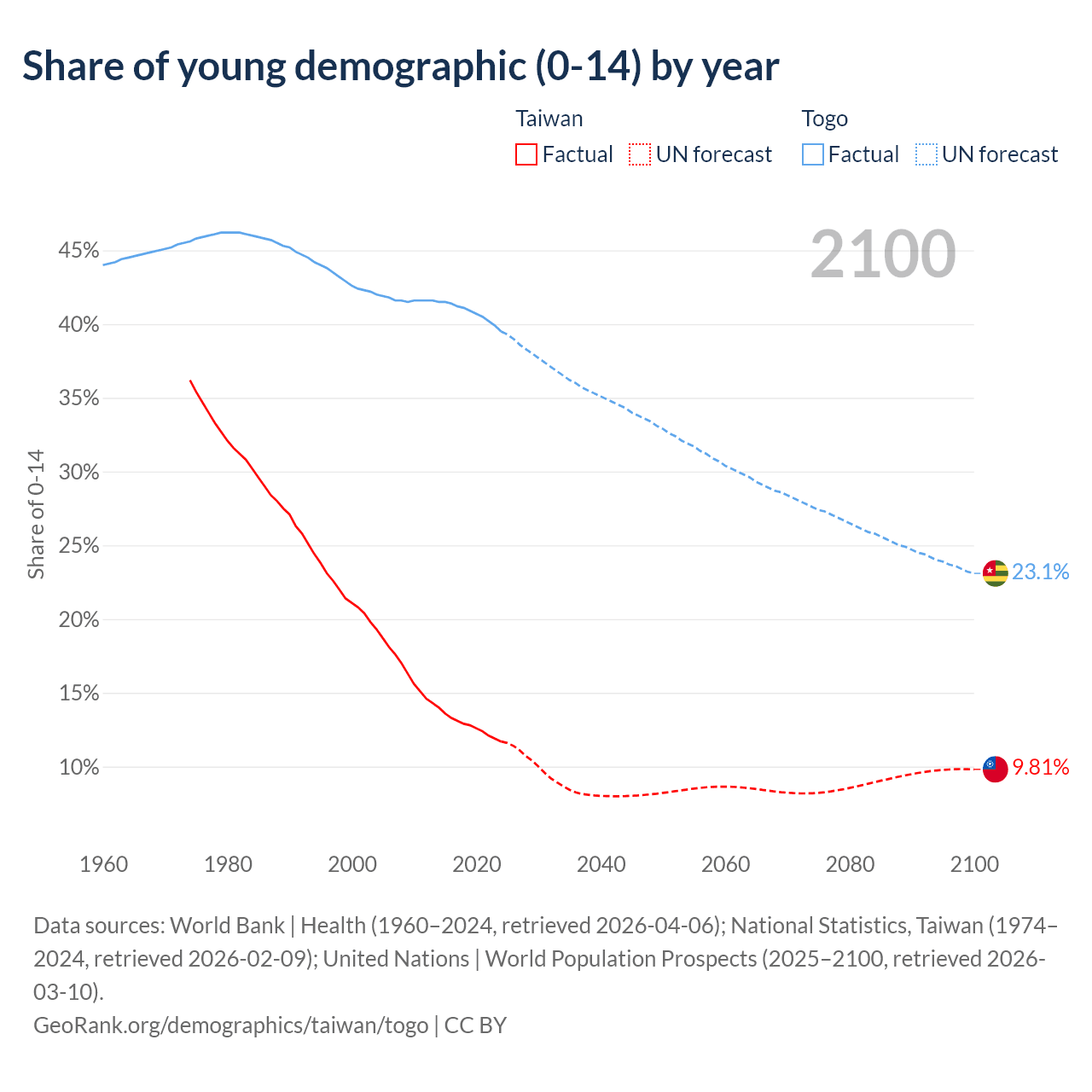 - The share of young demographic (0-15 years old) in Taiwan is 11.7% vs 39.5% in Togo.