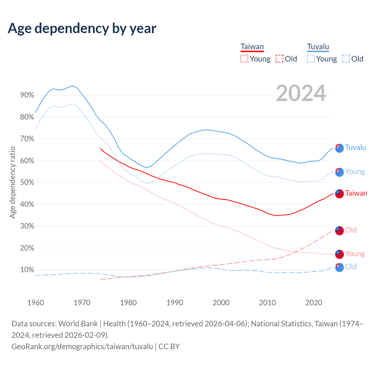 Data sources: World Bank | Health (1960–2024, retrieved 2026-04-06); U.S. Census Bureau (1960–2024, retrieved 2026-02-08); National Statistics, Taiwan (1974–2024, retrieved 2026-02-09).