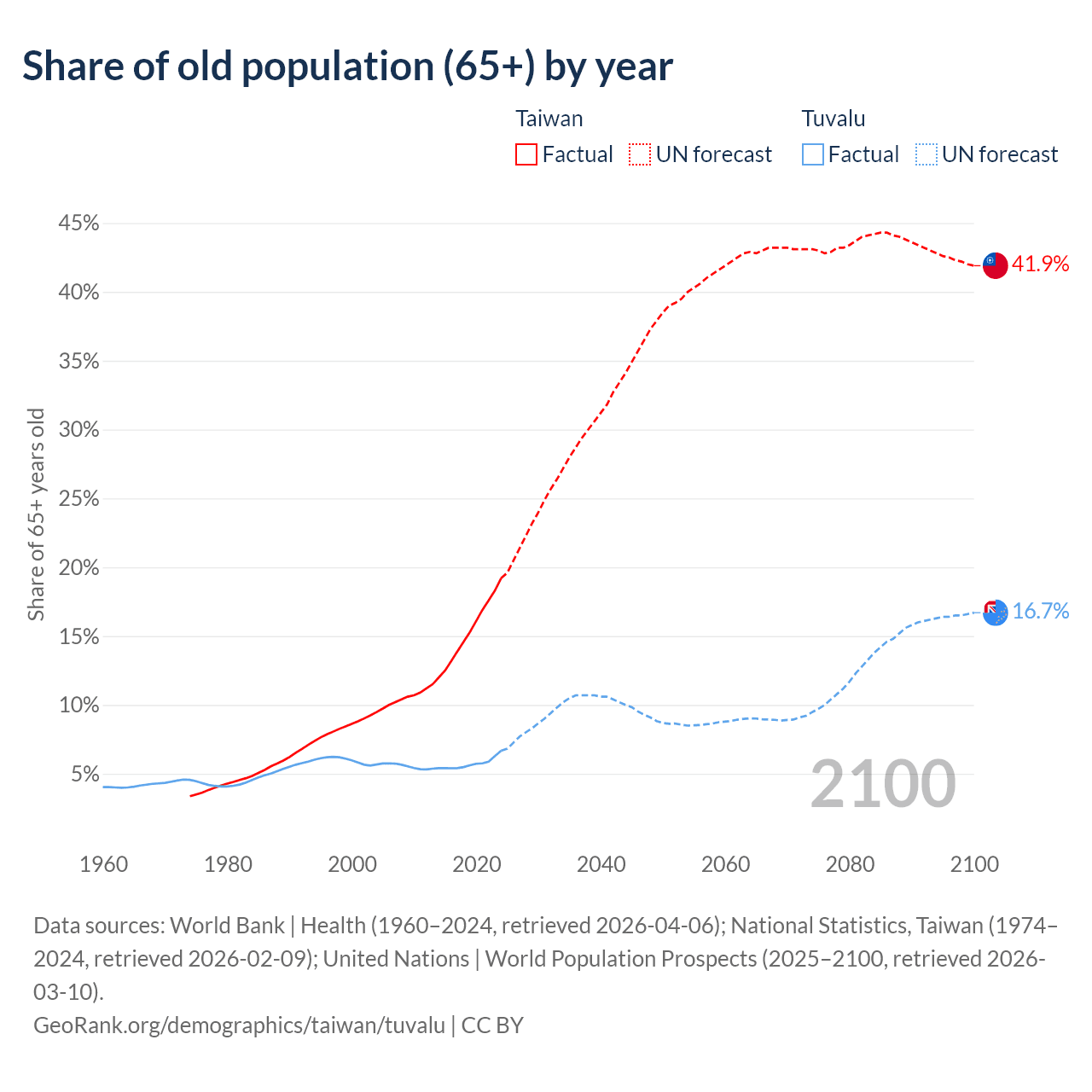- The share of old-age demographic (65+) in Taiwan is 19.2% vs 6.67% in Tuvalu.