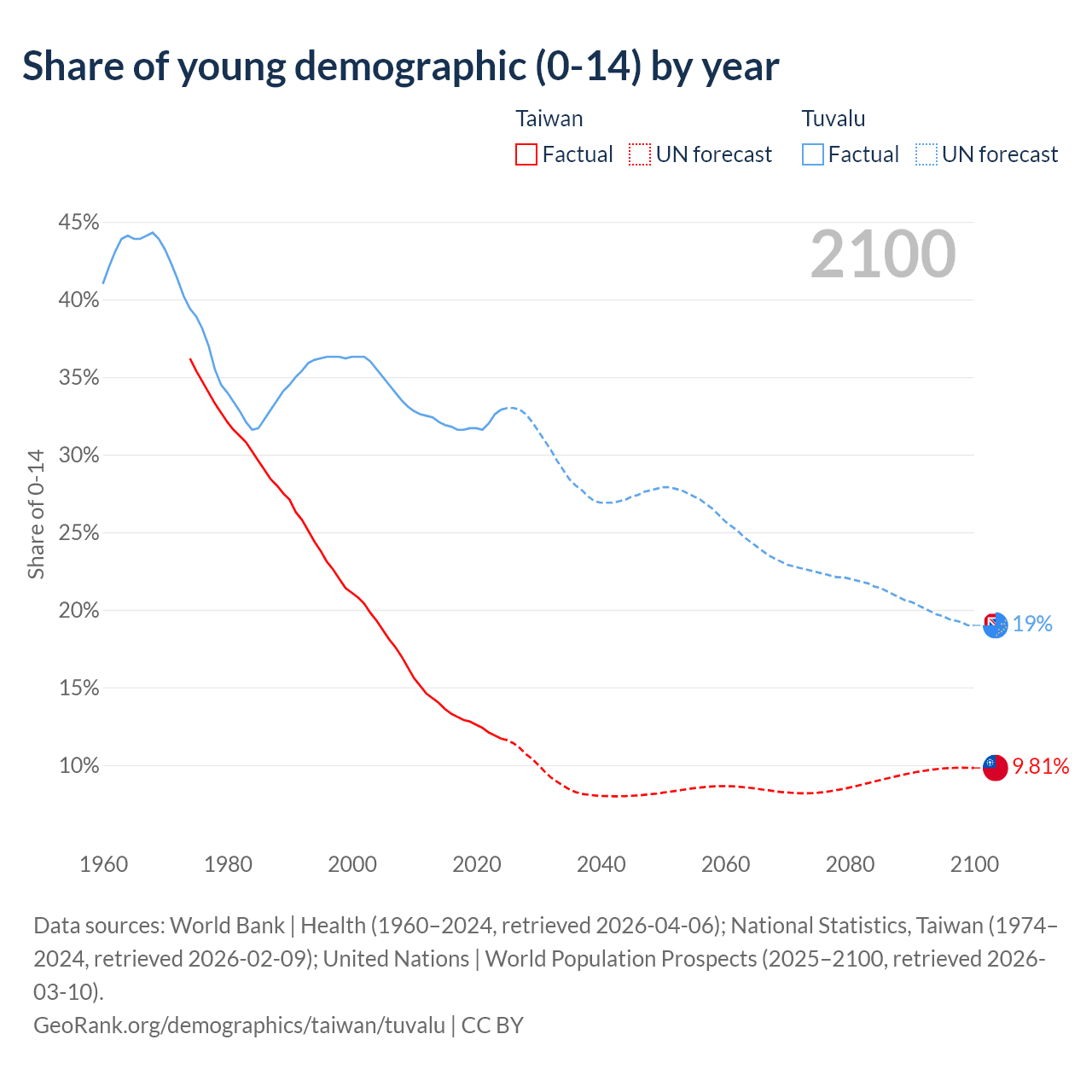 - The share of young demographic (0-15 years old) in Taiwan is 11.7% vs 32.9% in Tuvalu.