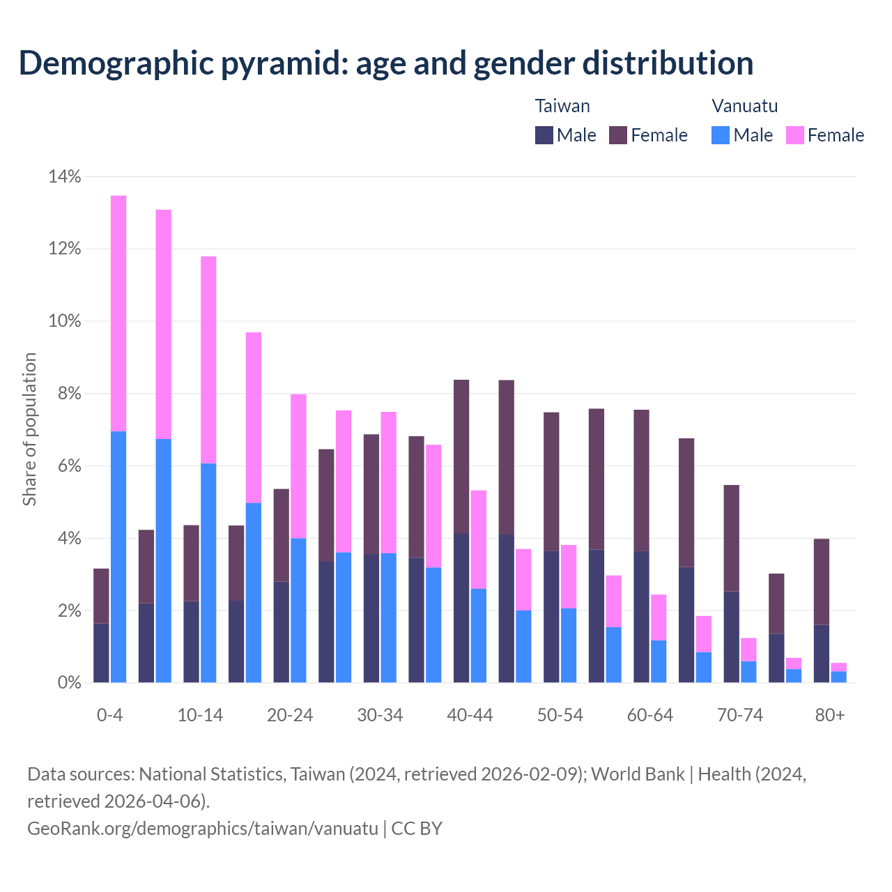 The share of older people aged 65 and over is 19.2% in Taiwan and 4.3% in Vanuatu. Life expectancy in Taiwan compared to Vanuatu .