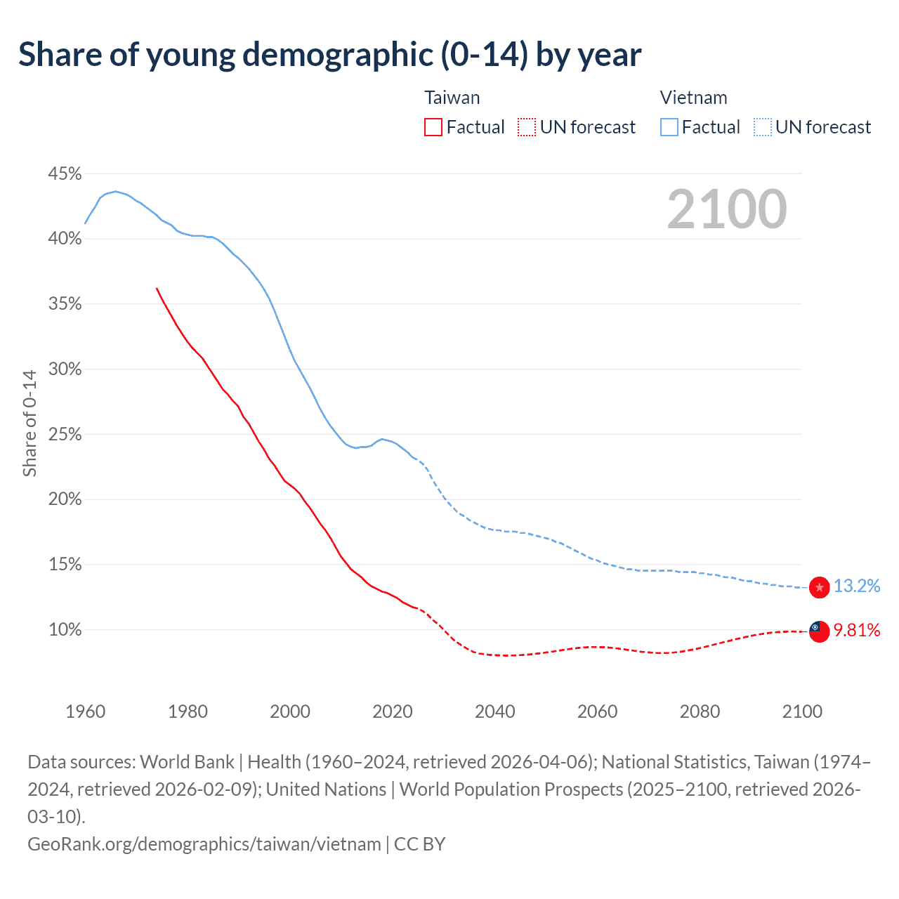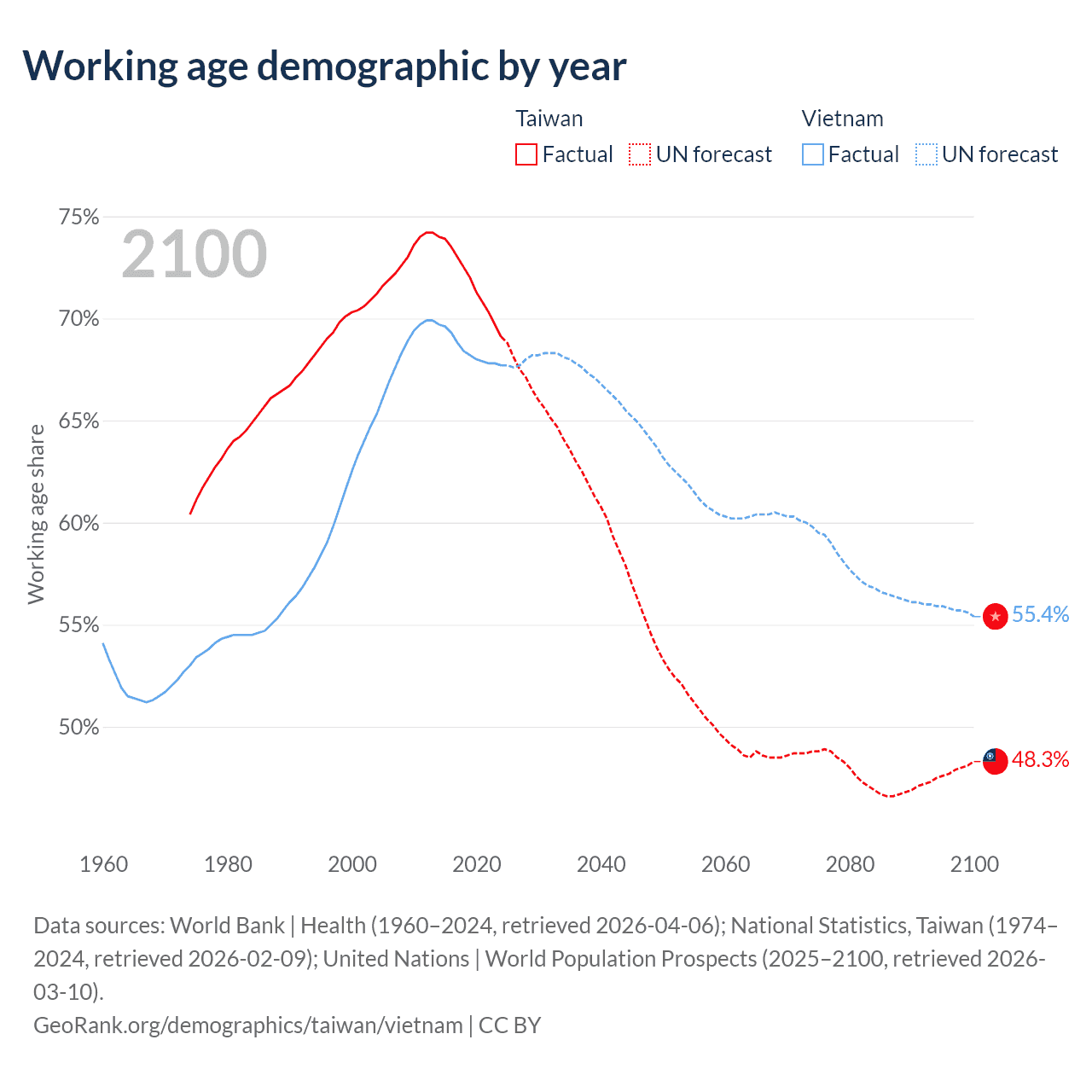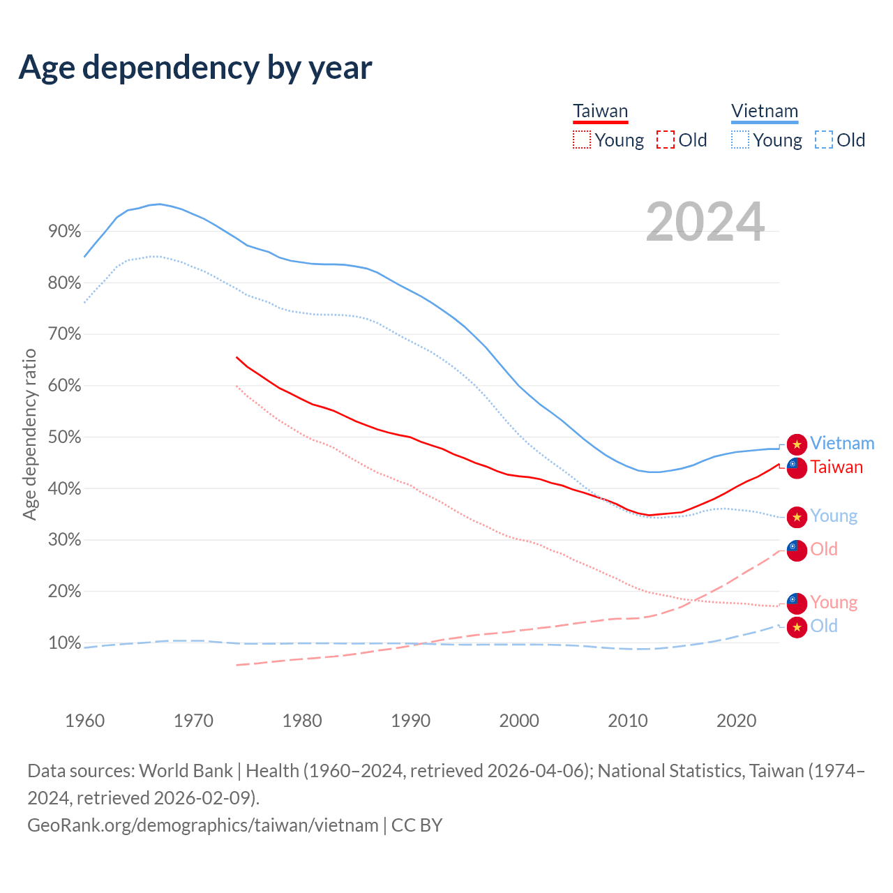 Data sources: World Bank | Health (1960–2024, retrieved 2026-04-06); U.S. Census Bureau (1960–2024, retrieved 2026-02-08); National Statistics, Taiwan (1974–2024, retrieved 2026-02-09).