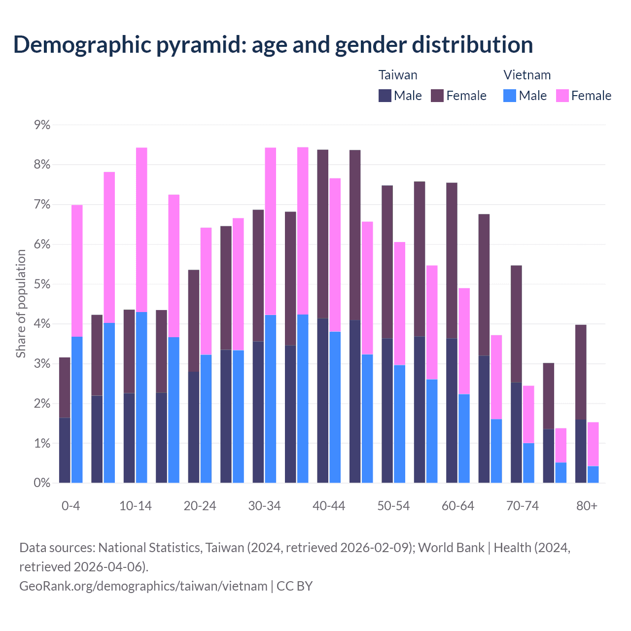 The share of older people aged 65 and over is 19.2% in Taiwan and 9.05% in Vietnam. Life expectancy in Taiwan compared to Vietnam .