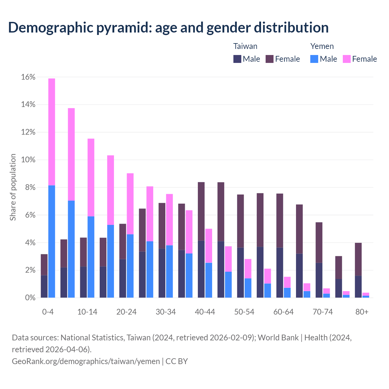 - Taiwan is ranked 16/196 by median age (oldest to youngest) vs 174/196 for Yemen.