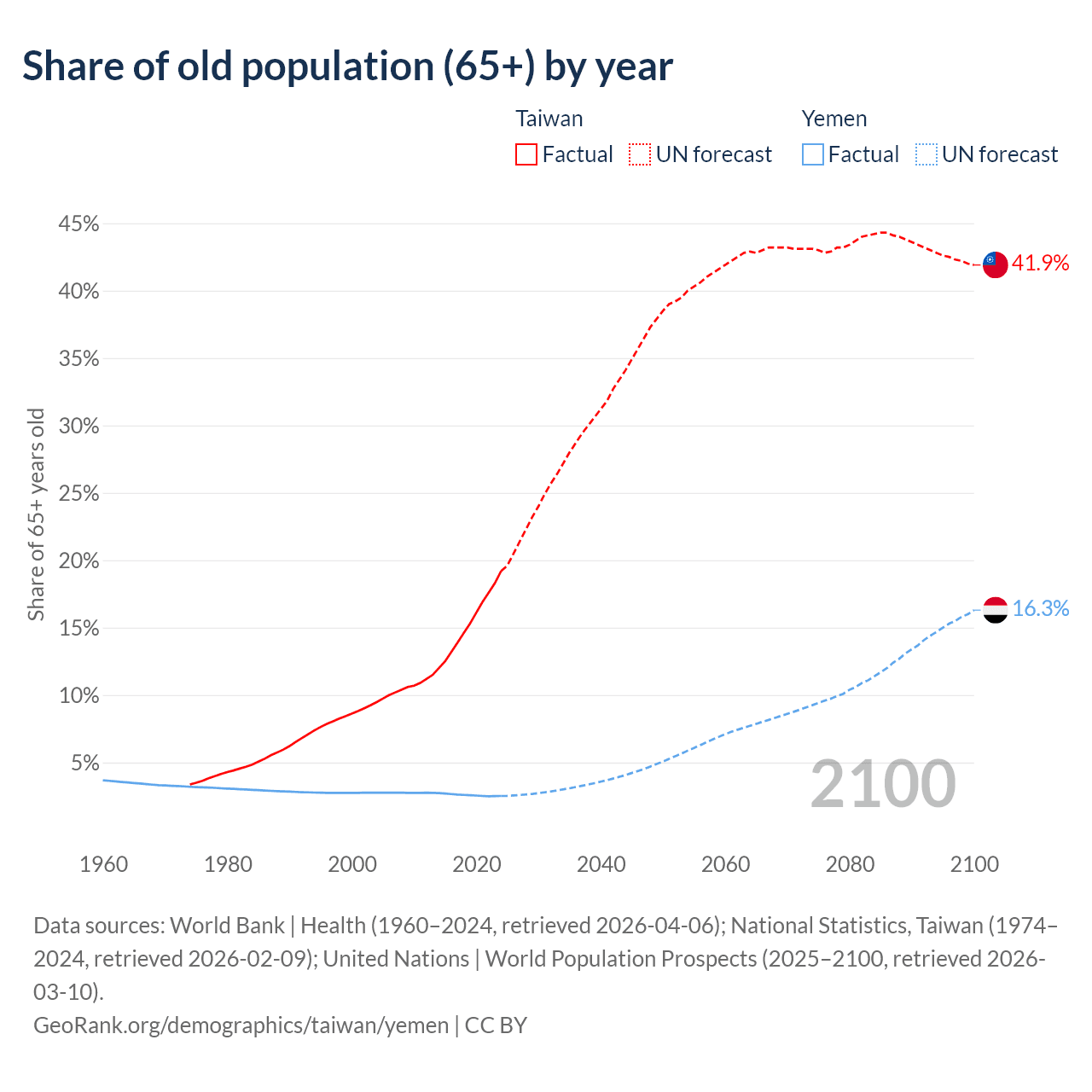 - The share of old-age demographic (65+) in Taiwan is 19.2% vs 2.52% in Yemen.
