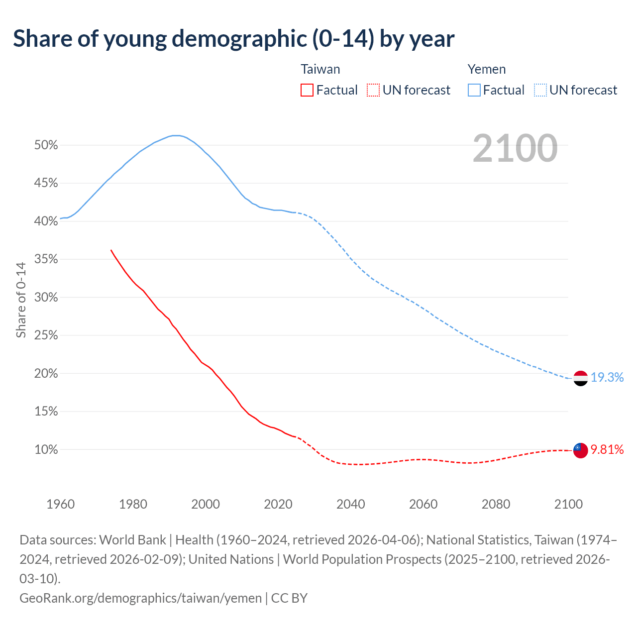 - The share of young demographic (0-15 years old) in Taiwan is 11.7% vs 41.1% in Yemen.
